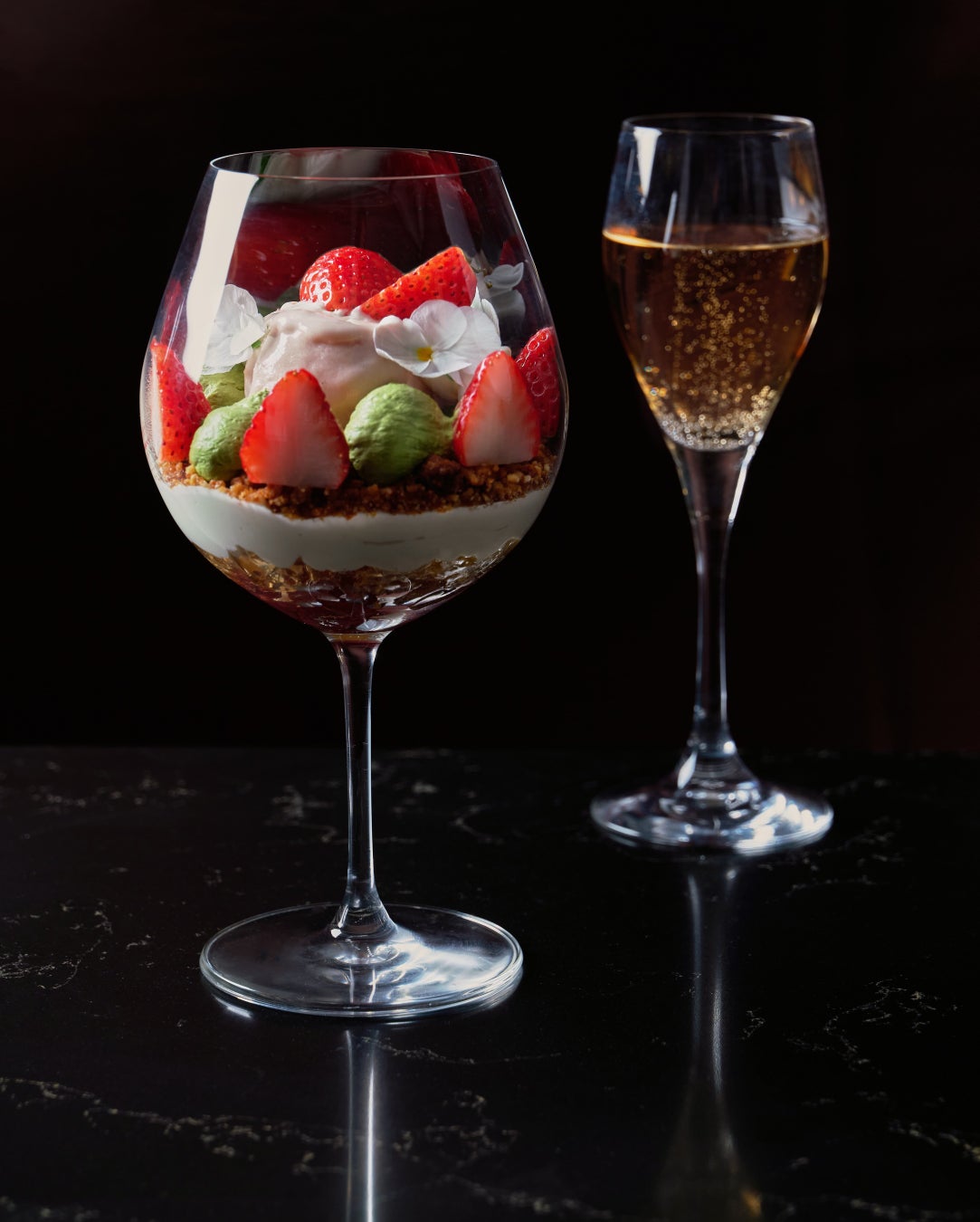 下層には、食感のアクセントとなるクランブル、そしてもうひとつの発酵クリームを忍ばせました。グラスの底にたたえられた日本酒のジュレと発酵いちごが織りなす自然な甘みは、最後のひと口まで美しい調和が続くよう仕立てられています。