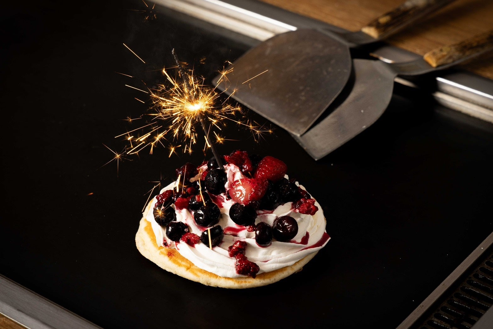 お祝いパンケーキ:ぱちぱち花火を載せたパンケーキ。歓送迎会にぴったりなデザートです。
