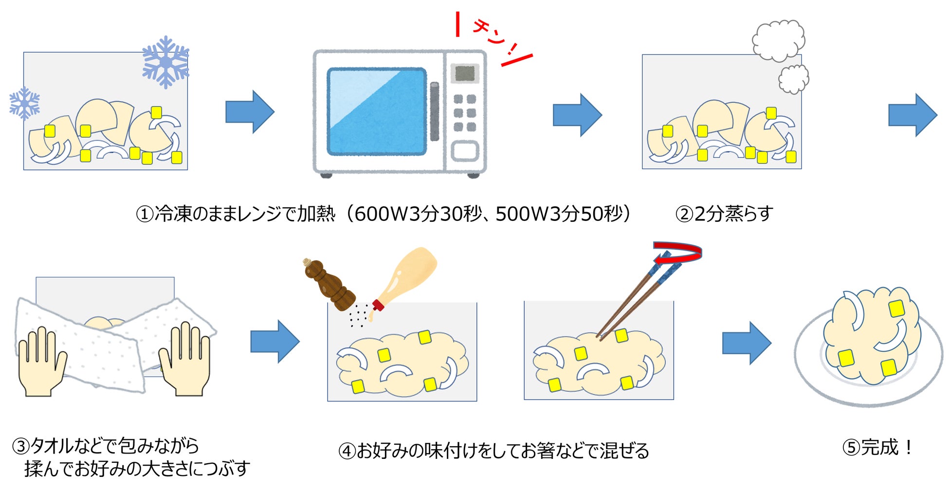 冷凍のまま袋ごと電子レンジで3分50秒(500W)加熱し、2分蒸らした後に袋の上から揉むだけでポテトサラダのベースが完成します。つぶし具合や調味料の量を調整など、仕上げ部分を自由に自分好みの味に仕上げられます。