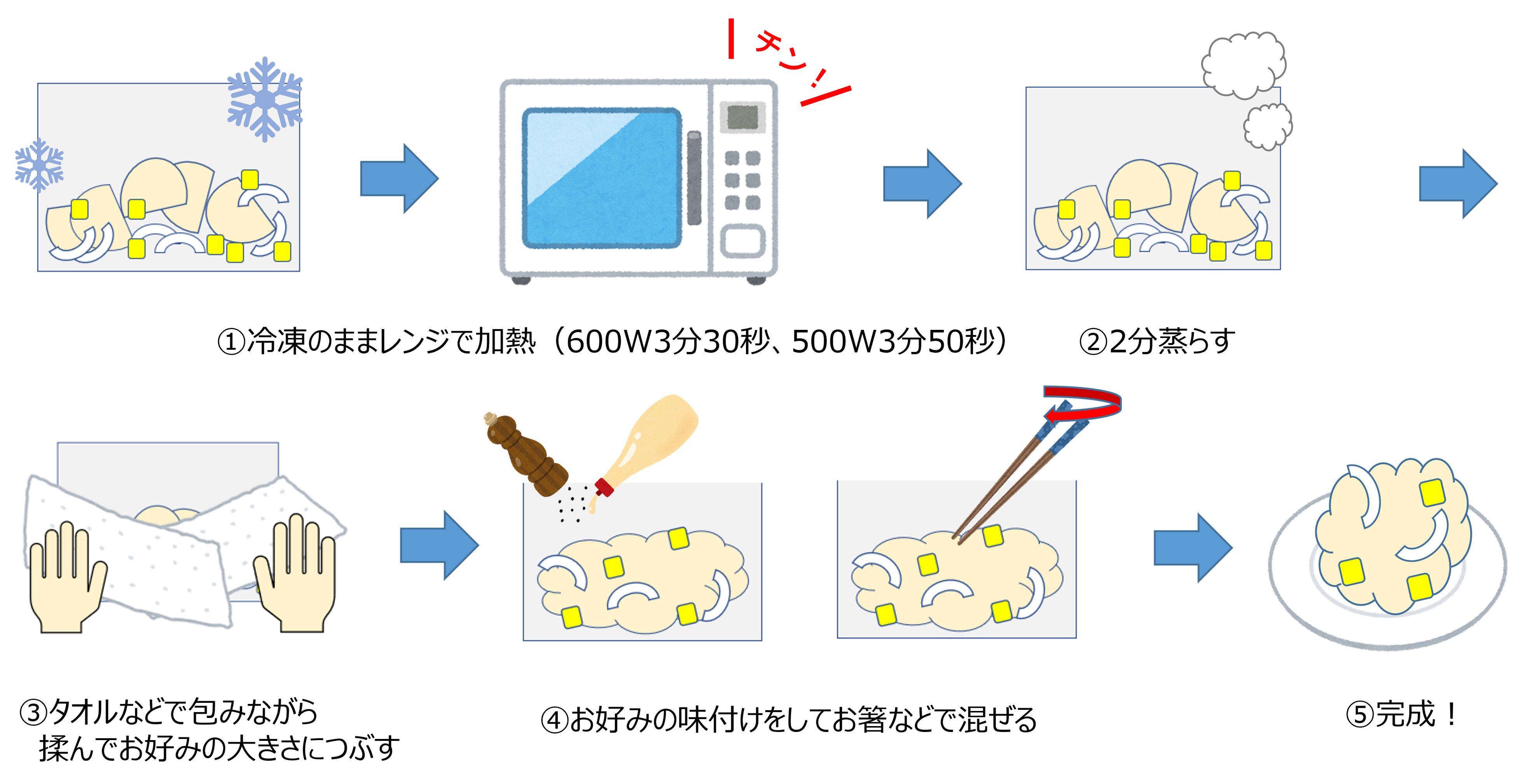 冷凍のまま袋ごと電子レンジで3分50秒(500W)加熱し、2分蒸らした後に袋の上から揉むだけでポテトサラダのベースが完成します。つぶし具合や調味料の量を調整など、仕上げ部分を自由に自分好みの味に仕上げられます。
