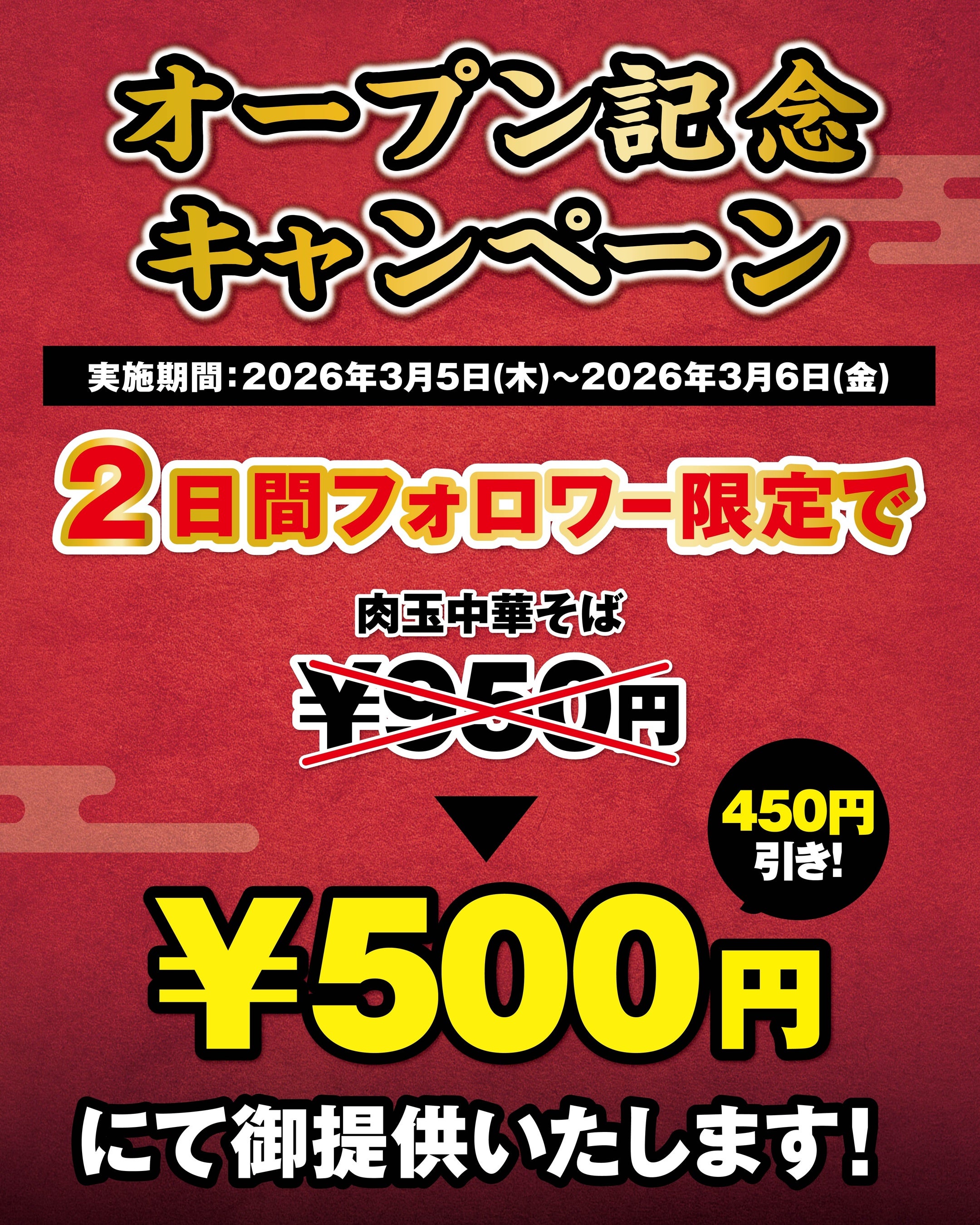 instagram公式アカウントをフォローした方限定で、2026年3月5日(木)~3月6日(金)の2日間で「肉玉中華そば(¥950)」をワンコイン500円でプレゼント!