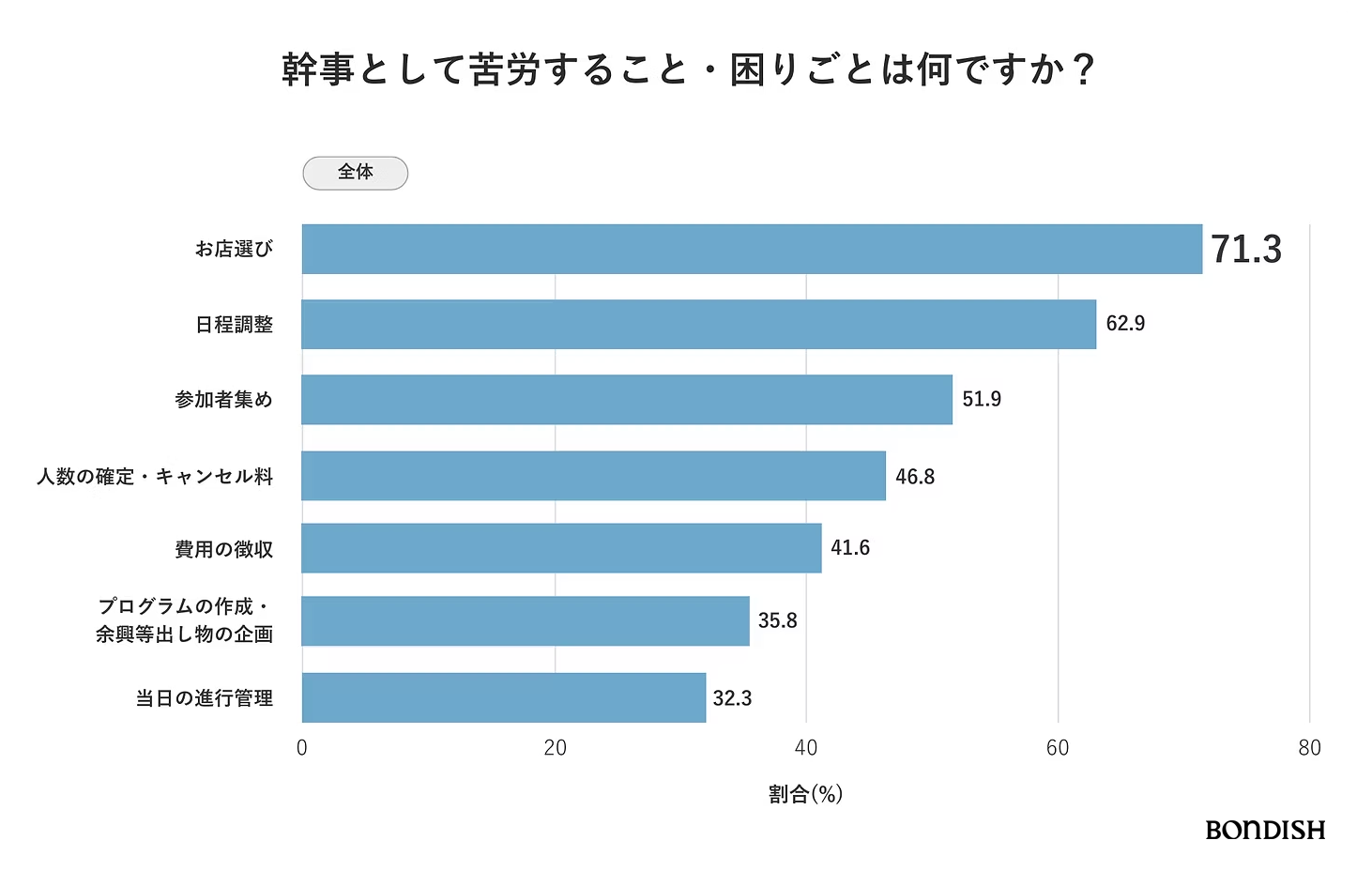 ボンディッシュが実施したアンケート調査では、懇親会における最大の悩みが「お店選び」であることが判明し、とくに40〜50代の“ベテラン幹事世代”で負担感が強く表れました(図1)。こうした背景から、移動・予約・会計などの手間を削減し、オフィスで完結するケータリングへの関心が高まっています。
