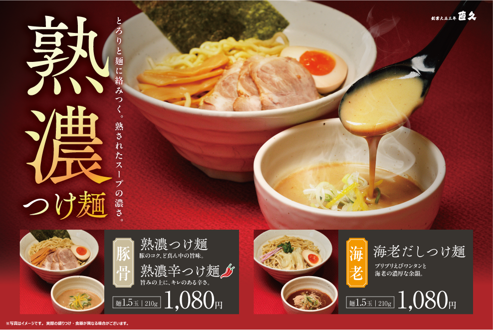 株式会社鉄人化ホールディングスグループである、株式会社直久(東京都目黒区、代表取締役社長:兒玉智之)が運営する老舗らーめん店「銀座直久」では、2026年3月2日(月)より、新たに3種のつけ麺を販売いたします。直久の原点である“鶏”の旨みを軸に、濃厚豚骨、辛味味噌、そして海老の旨みを掛け合わせた、これまでにない力強い一杯に仕上げました。