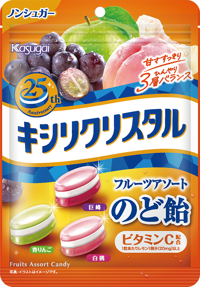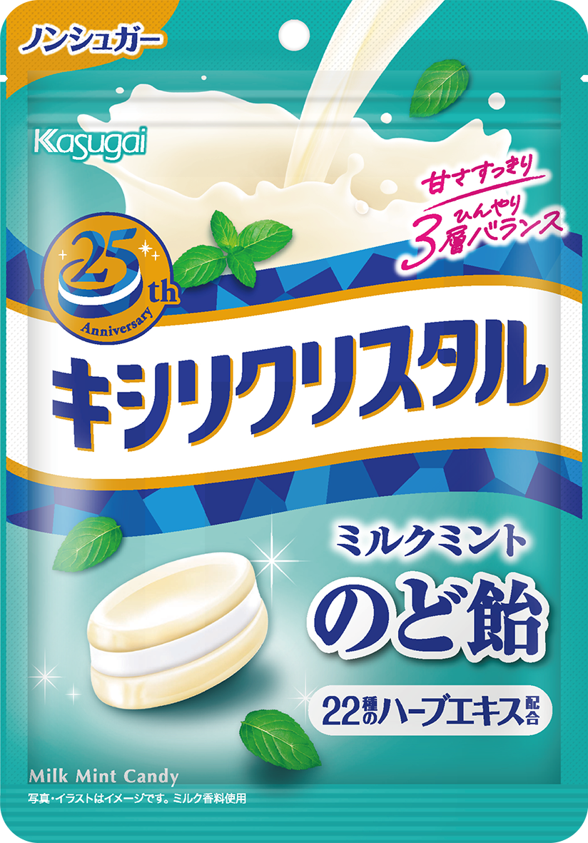 日本で初めてキシリトールをキャンディにして発売した「キシリクリスタル」は、たくさんのお客様にご支持いただき今年で発売25周年を迎えます。2001年の発売当時、3層の見た目やキシリトール層のひんやり、そして今では定番の「ミルクミント」という味わいは大変目新しく、話題になりました。現在のレギュラー品「ミルクミントのど飴」「フルーツアソートのど飴」の他にも、これまで期間限定商品を数多く発売し、その時代のお客様のニーズに合わせた商品づくりを続けています。