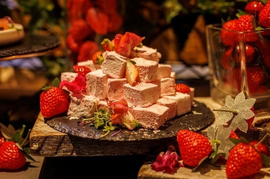 アパレイユをたっぷりしみこませたしっとりとしたフレンチトーストに、エルダーフラワーの香りをまとわせた たっぷりのクリームをのせ季節のベリーの特製ソースをかけてお召し上がりいただく春限定のフレンチトースト。さわやかな香りとベリーの酸味がさっぱりと食べられる商品に