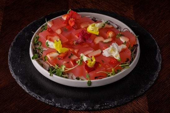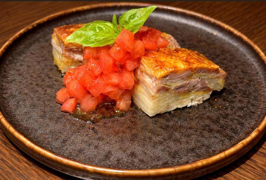 ハーブとスパイスを効かせた塩漬けの豚肉と甘みの強い白菜をミルフィーユ状にして焼き上げた、春の肉料理。召し上がる際に、トマトを使用したシェフ特製ケッカソースを付けてお召し上がりいただく事で、2種類の味もお楽しみいただけます。