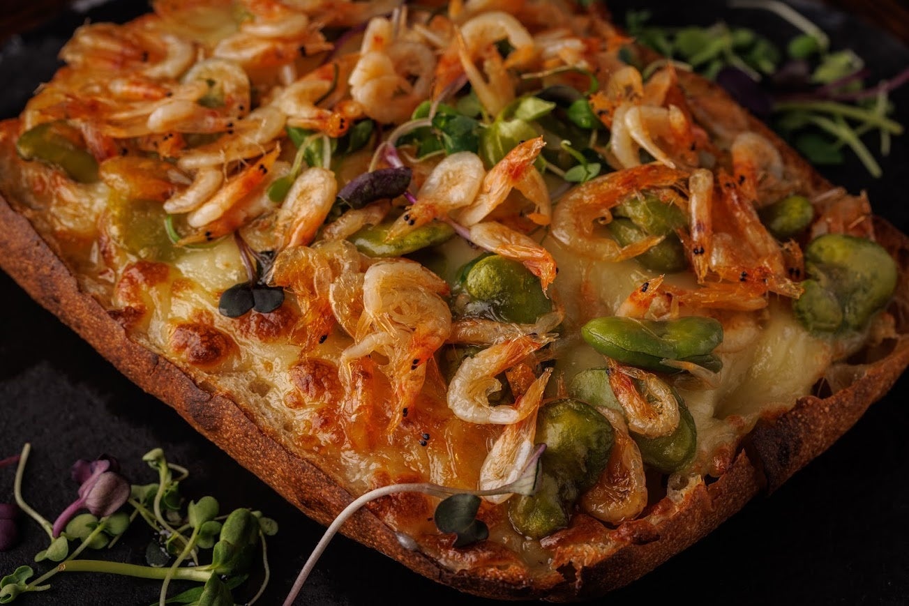 ガーリック香るオイルに漬けた旬の桜エビとそら豆を高加水なフォカッチャ生地をベースにたっぷりのチーズと共に香ばしく焼き上げた、イタリアでピンサと呼ばれるpizza仕立て。この時期しか味わう事の出来ない期間限定のメニューです。