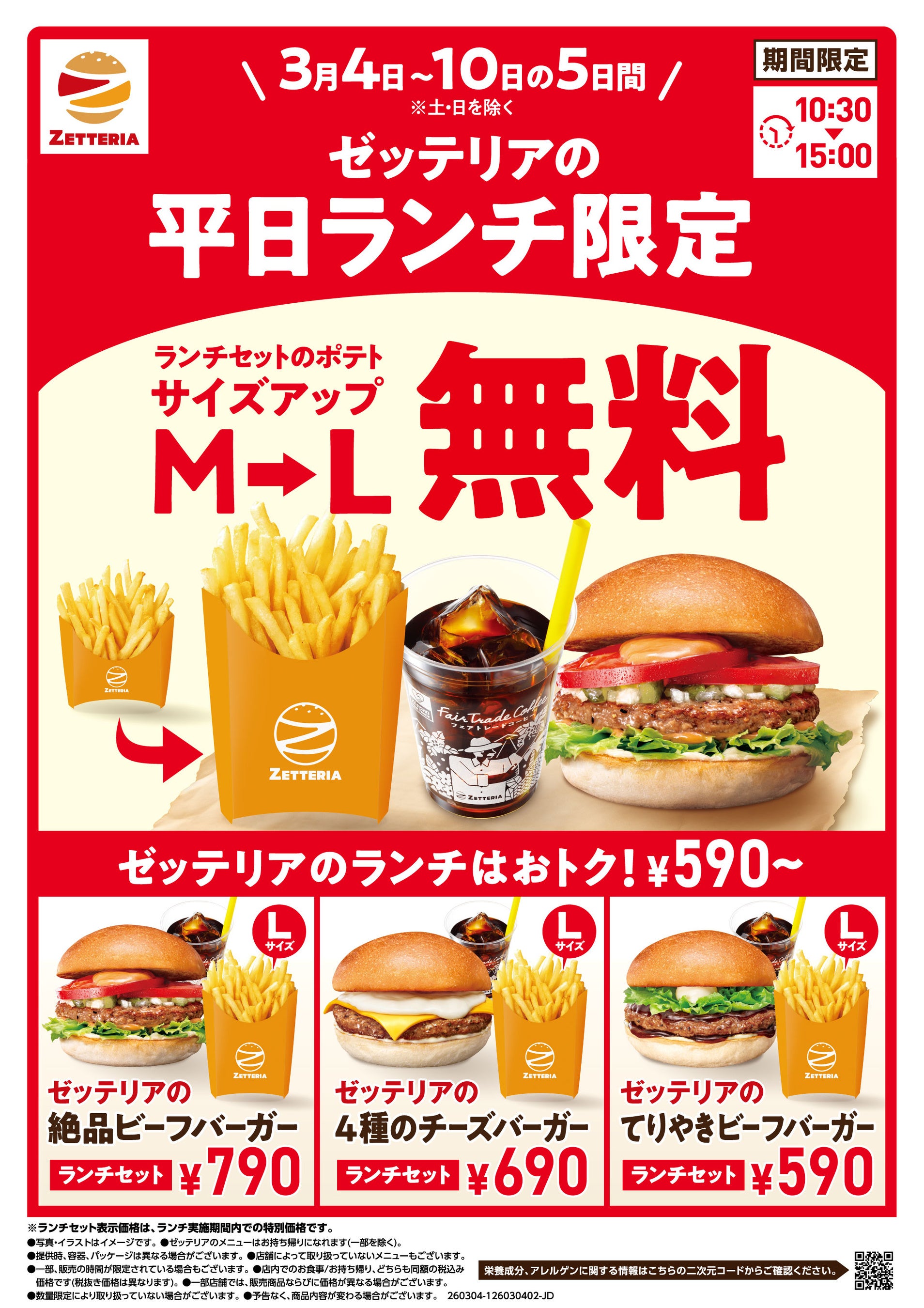 株式会社バーガー・ワン(代表取締役社長:井上 卓士 本社:東京都港区)が展開するハンバーガーショップ「ゼッテリア」は、平日のランチタイム(10:30~15:00)限定で590円から販売しているランチセットを、さらにお得にお楽しみいただけるよう、セットの「フレンチフライポテト」をMサイズからLサイズに無料でサイズアップできるキャンペーンを、3月4日(水)から3月10日(火)までの平日5日間限定で開催します。