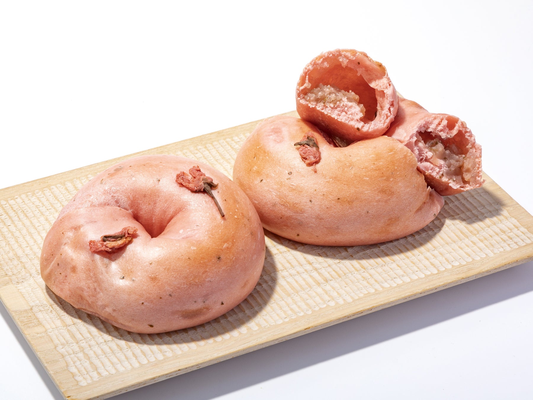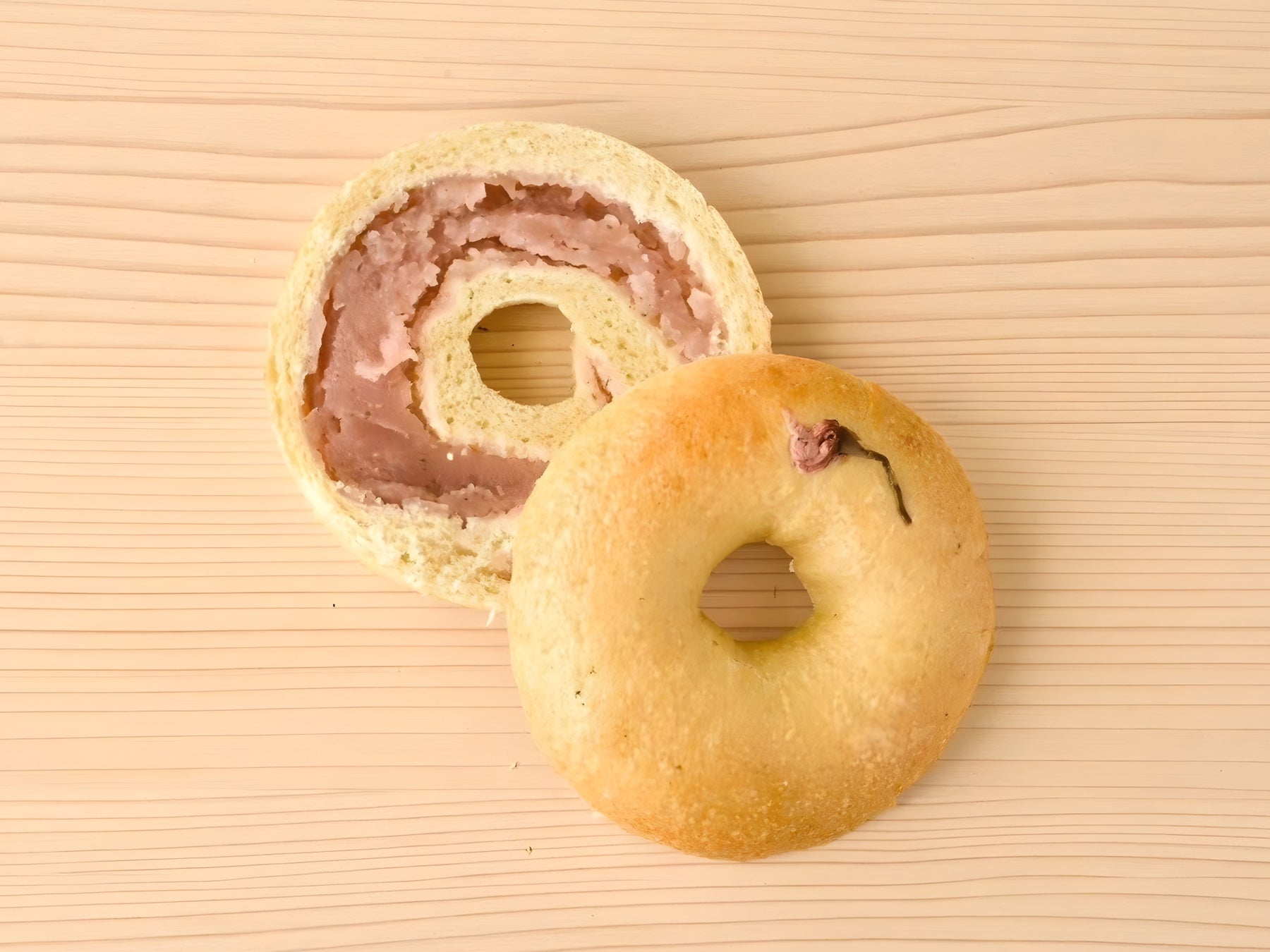 しっとり、もちもちの桜ベーグルに、もちフィリングと桜あんを包み込み、桜花の塩漬けをトッピングした、春だけの特別なベーグルです。