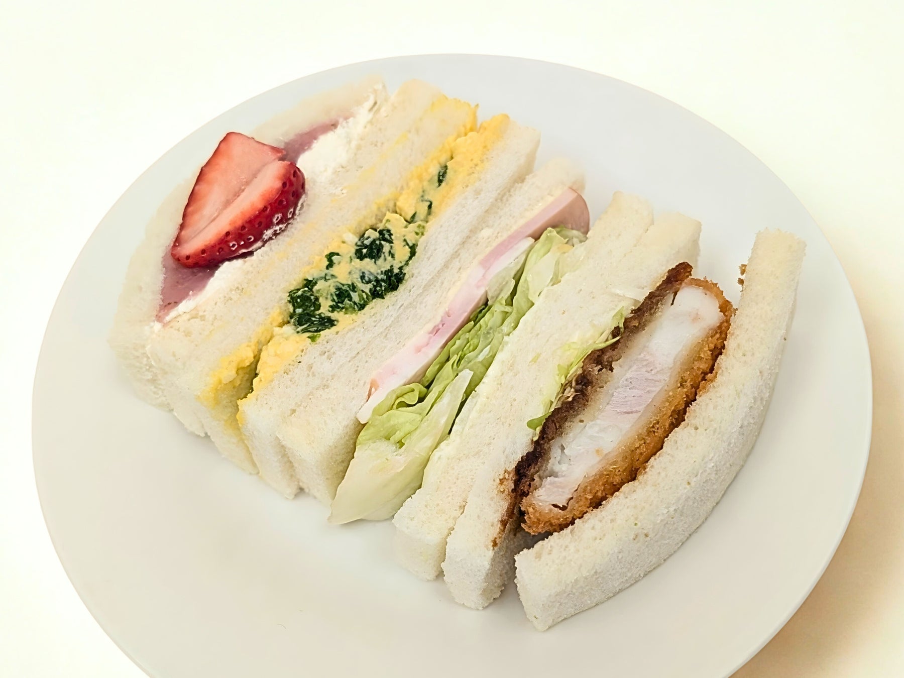 ロースカツは、ジューシーな豚ロースをサクッと揚げた食べ応えのある味わい。ハムサンドは旨み広がる熟成ハムの定番サンド。菜の花サンドは、ほろ苦さが春を感じさせる一品。桜あん苺サンドは、桜の香りと苺の甘酸っぱさが楽しめるデザートサンド。4種類が楽しめる春のおすすめ商品です。