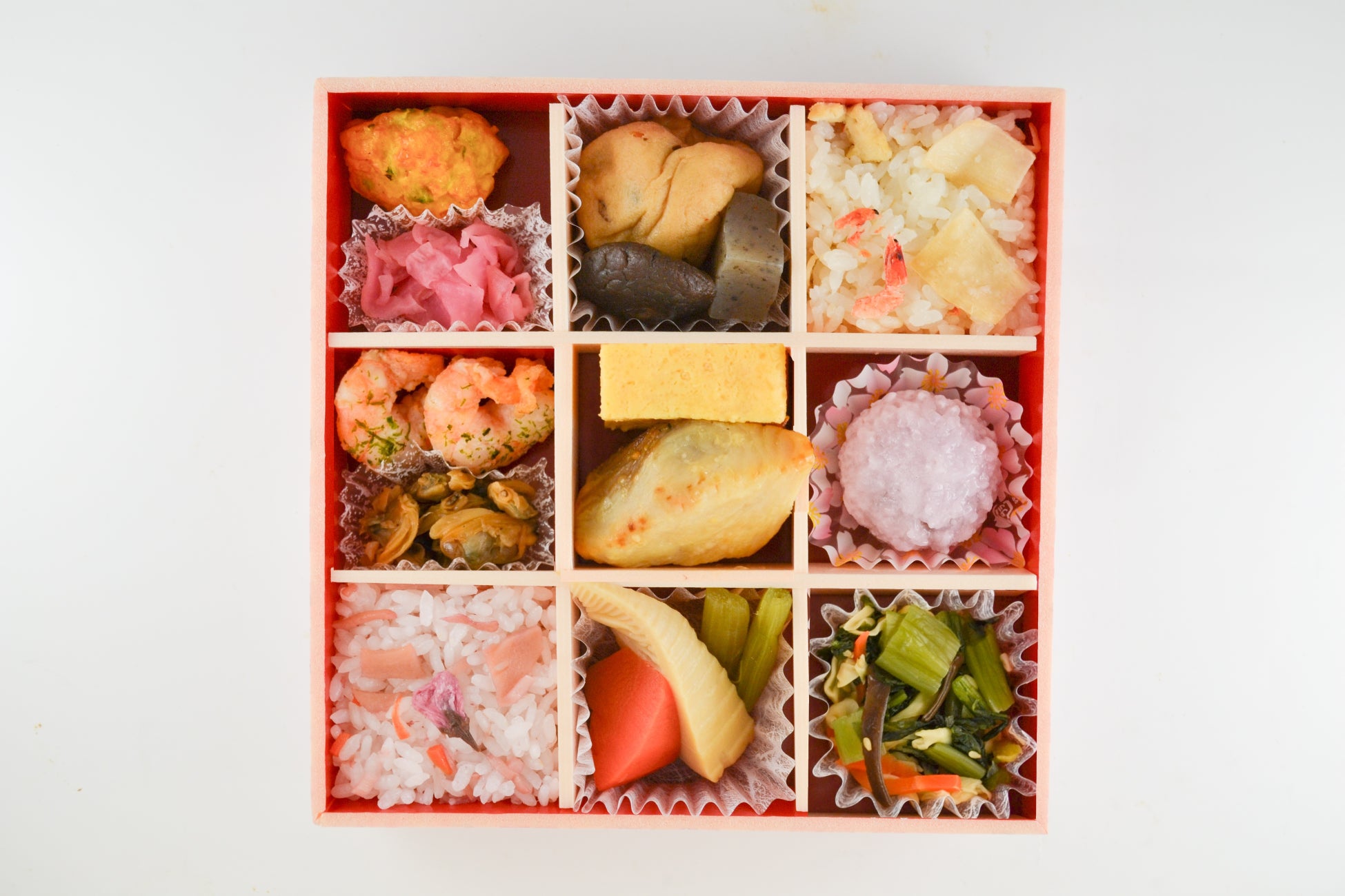 桜の花びらを混ぜ合わせたちらしご飯と、桜えびの炊き込みご飯の2種類のご飯で、春らしい彩りをお楽しみいただけるお弁当です。旬の鰆の西京焼や桜餅など、春を感じるおかずを詰め合わせた、行楽のお供にもぴったりの一品です。