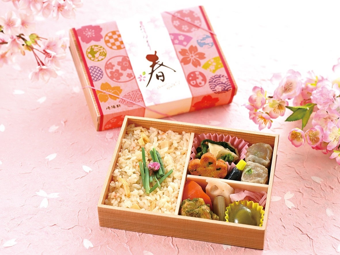 筍の炊き込みご飯に桜の花の塩漬けと山セリを添え、鶏の青海苔唐揚げや伝統のシウマイを贅沢に盛り込んだ、春の訪れを五感で楽しむ小ぶりなお弁当です。