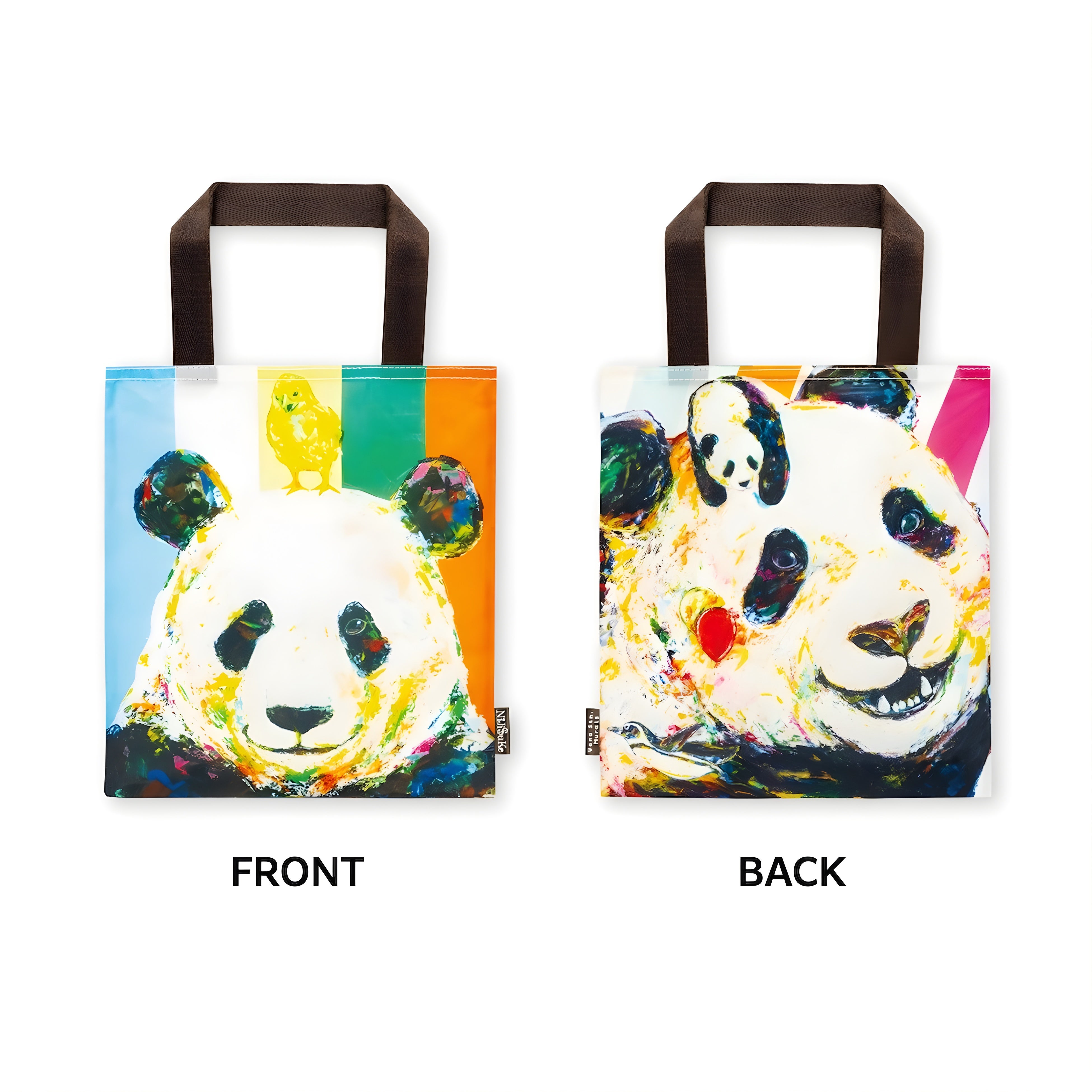 愛らしいパンダのイラスト、ミューラルアートで実際に描かれたライブペインティングのイラストがトートバッグになってカプセルトイで販売中。