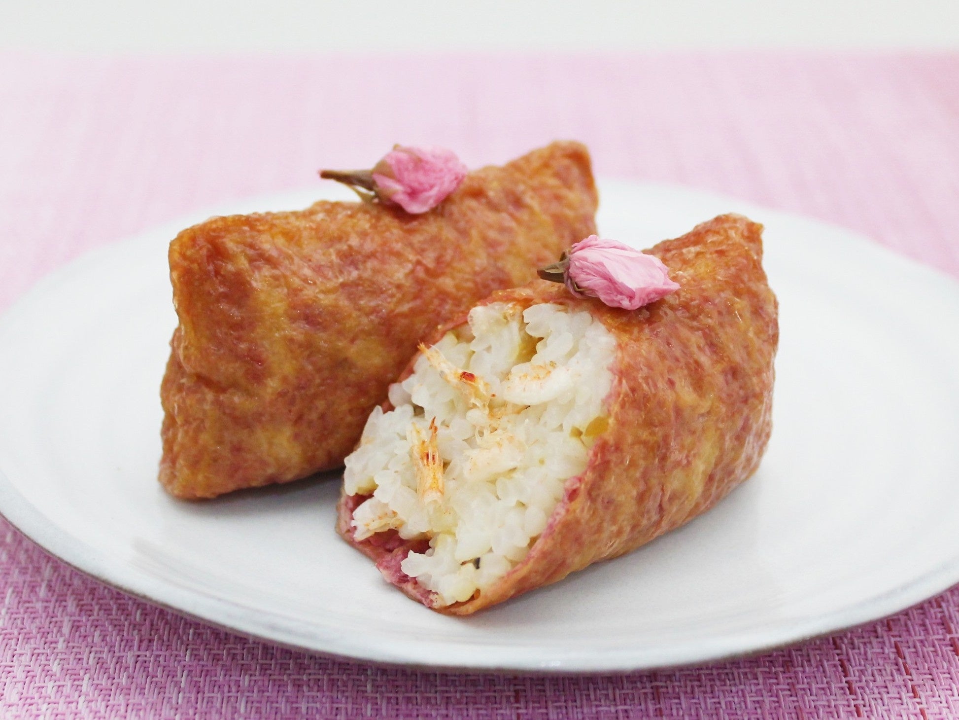 桜色のかわいいおいなりさん。香ばしい桜海老と桜の塩漬けをのせました。目でも舌でも桜をお楽しみください。