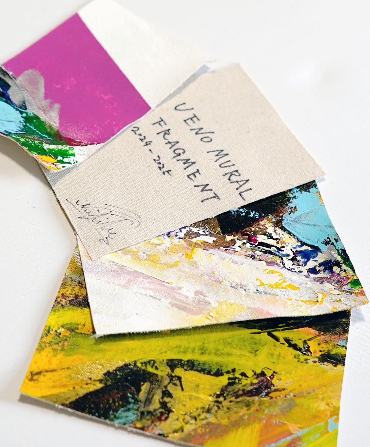 ライブペインティング会場(とまり木)では、JR上野駅構内で飾られていた歴代壁画の”キャンバス断片”を、数量限定でプレゼント。1点ずつ異なる、世界にひとつだけのアートピースです。