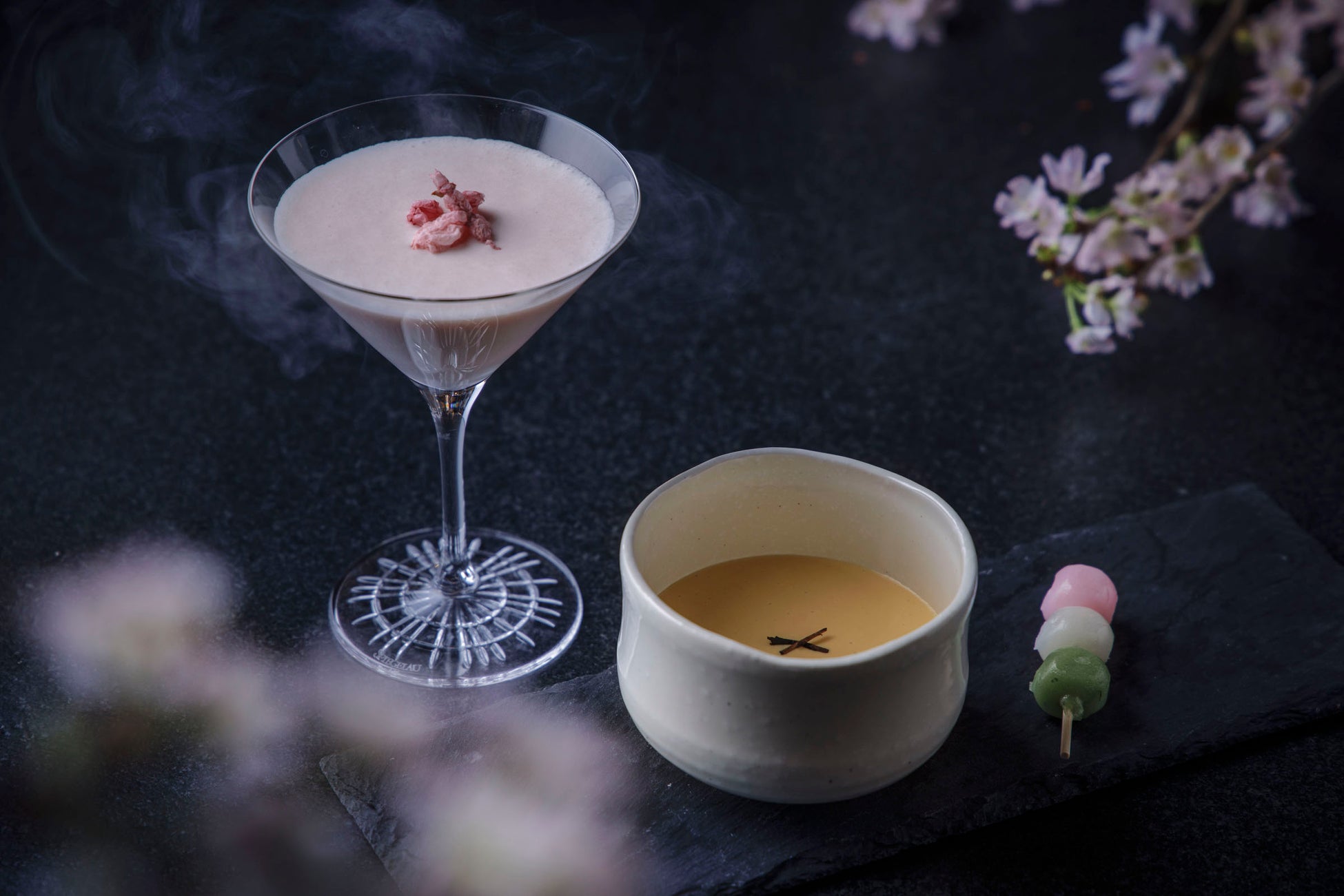 お花見団子から着想を得た、愛らしくも奥行きのある一杯。桜リキュールのやさしい甘みとミルクのまろやかさに、白玉の食感が春の情景を思わせます。ライトアップされたガーデンを眺めながら、ここだけの優雅なお花見体験をご堪能ください。