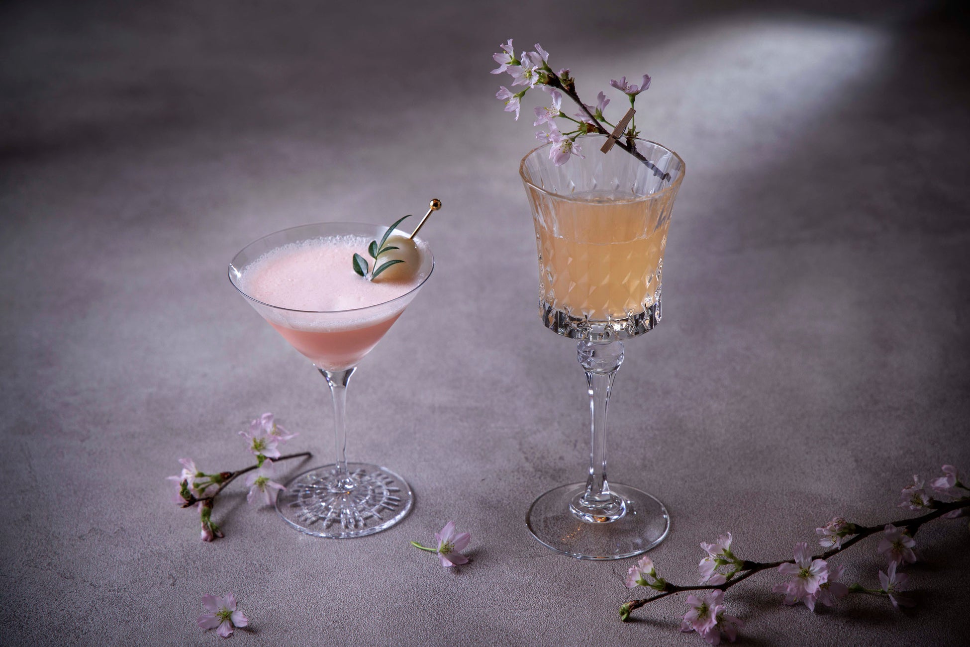 スモークとリフレクションをテーマにしたインテリアと最上階から臨む東京の煌めく景色が幻想的なスカイバー「エスカリエ」では、春の到来を感じる桜をイメージした2種類のオリジナルスイーツカクテルをお届けします。心躍るカクテルを片手に、春の訪れをお楽しみください。