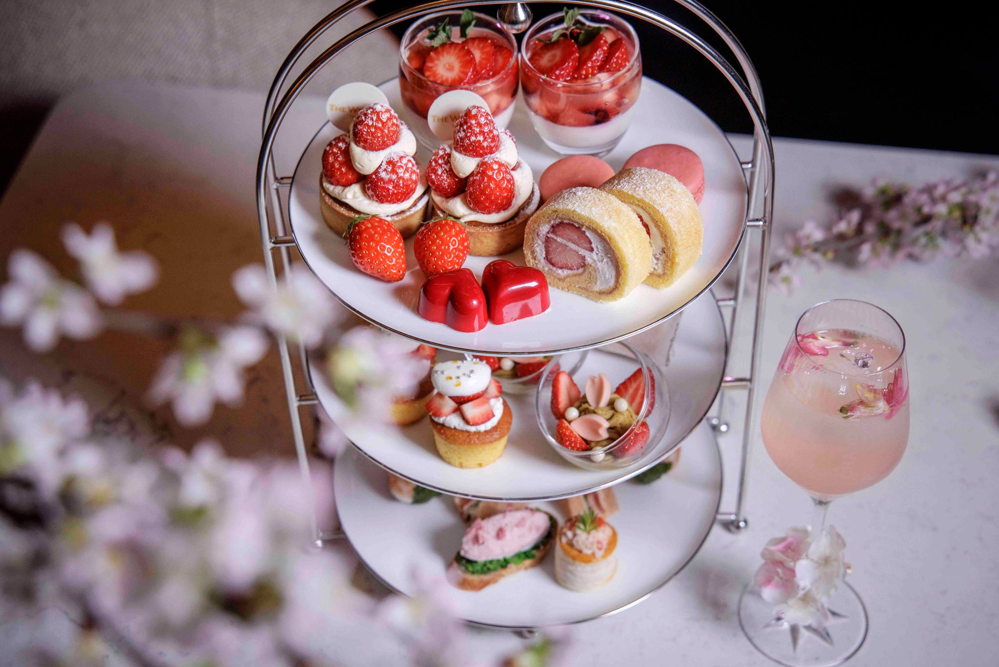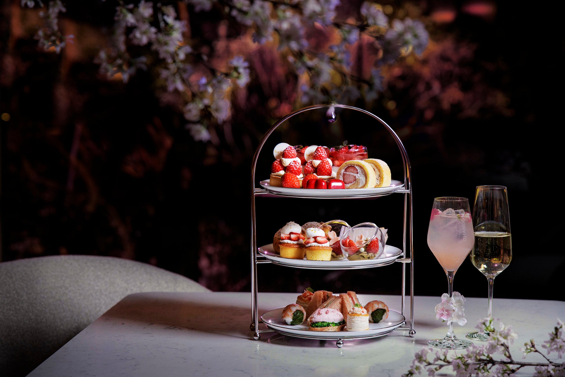ウェスティンガーデンに咲く桜を望む窓側席5卓限定でお届けする、春の宵を彩るナイトハイティー。「苺のタルト」や「苺とピスタチオのモンブラン」など旬の苺を贅沢に使用したスイーツに、「桜色のミックスサンド」や桜の葉で巻いた「海老手毬寿司」、「鶏と桜花のムース 菜の花のカナッペ」など、春の彩りを映したセイボリーを織り交ぜた三段スタンドをご提供します。