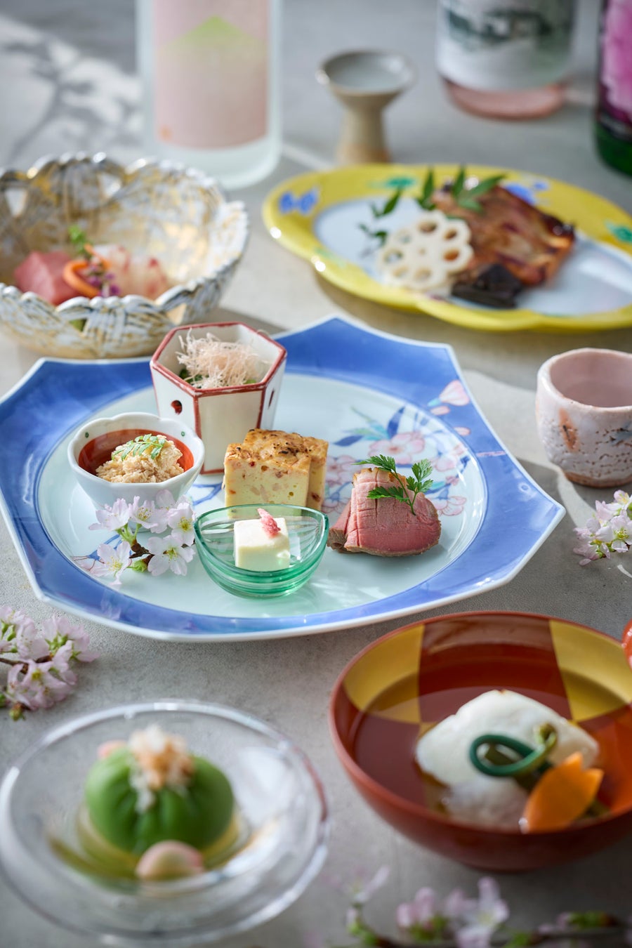 四季折々の上質な食材を用い、職人の技で繊細な季節の移ろいを表現する日本料理「舞」では、春の訪れを五感で堪能いただく「桜会席」をご提供いたします。青豌豆のやさしい甘みを閉じ込めた先付けに始まり、蛤真丈のお椀や桜鱒の塩麴焼き、蛍烏賊と山菜の酢味噌掛けなど、海と山の旬の恵みを取り入れた一皿ひとさらが春の情景を映し出します。和牛サーロインステーキや桜と苺の和風パフェまで、素材の持ち味を丁寧に引き出した料理の数々で、桜咲く季節ならではの優雅なひとときをお楽しみいただけます。お料理にあわせて、春や桜にちなんだ季節を感じる日本酒もご用意。厳選されたお酒が春の雰囲気と料理の味わいを引き立てます。