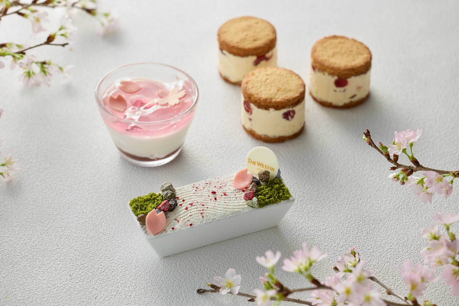 「パティスリー・バイ・ウェスティンホテル東京」では、日本庭園の美しさをイメージした新作の「桜の枯山水ティラミス」や、桜の花びらと葉で香りづけした「桜のブランマンジェ」、2種類の桜リキュールをしみこませたドライクランベリーが華やかに香る「桜とクランベリーのバターサンド」の3種類のスイーツと季節限定のクッキー缶をご用意しました。
