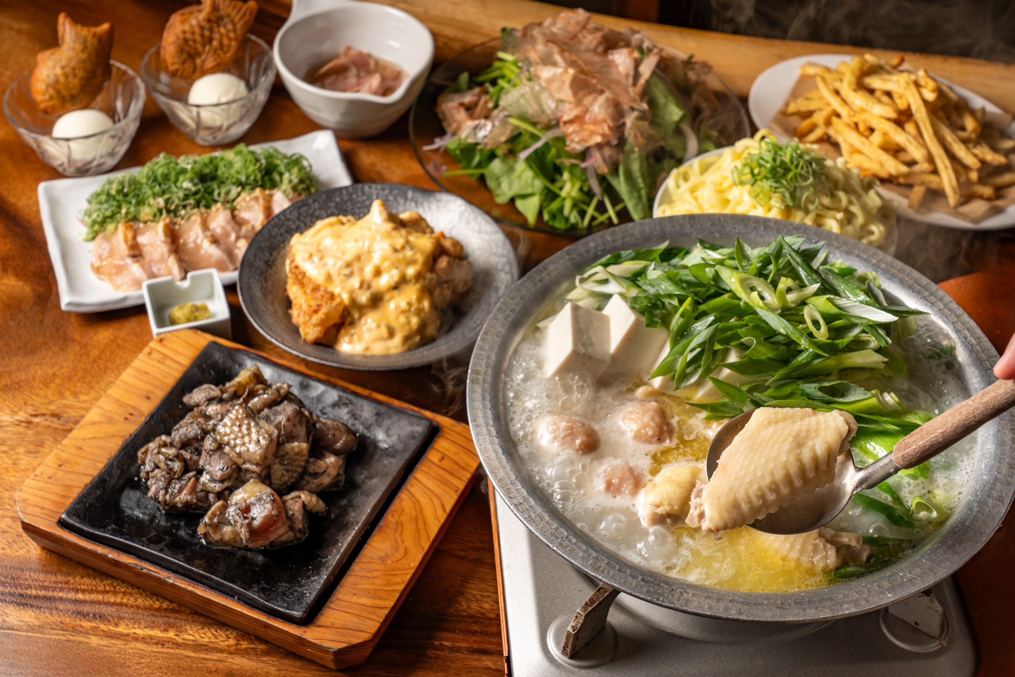鶏の旨味がたっぷりと染み出た濃厚なスープが嬉しい水炊きをメインに地鶏の炭火焼き、若鶏のチキン南蛮など塚田農場らしさも楽しめるプラン。