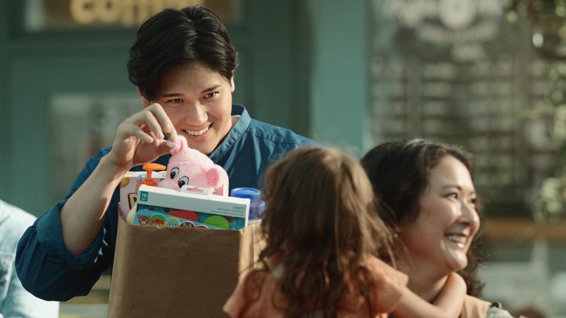 本CMでは、大谷翔平選手が子どものために紙袋いっぱいの玩具を買いに出かけた帰り道、信号待ちをする女の子に優しく微笑みかけ、目を合わせながらやりとりする和やかなシーンが描かれています。