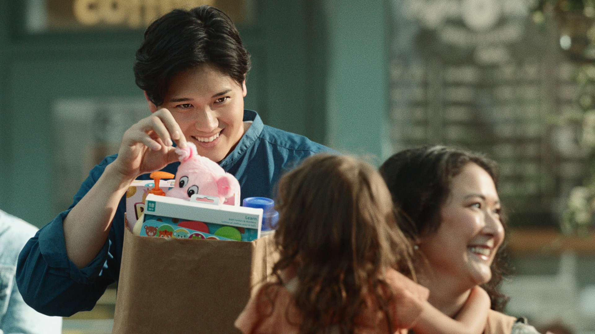 本CMでは、大谷翔平選手が子どものために紙袋いっぱいの玩具を買いに出かけた帰り道、信号待ちをする女の子に優しく微笑みかけ、目を合わせながらやりとりする和やかなシーンが描かれています。