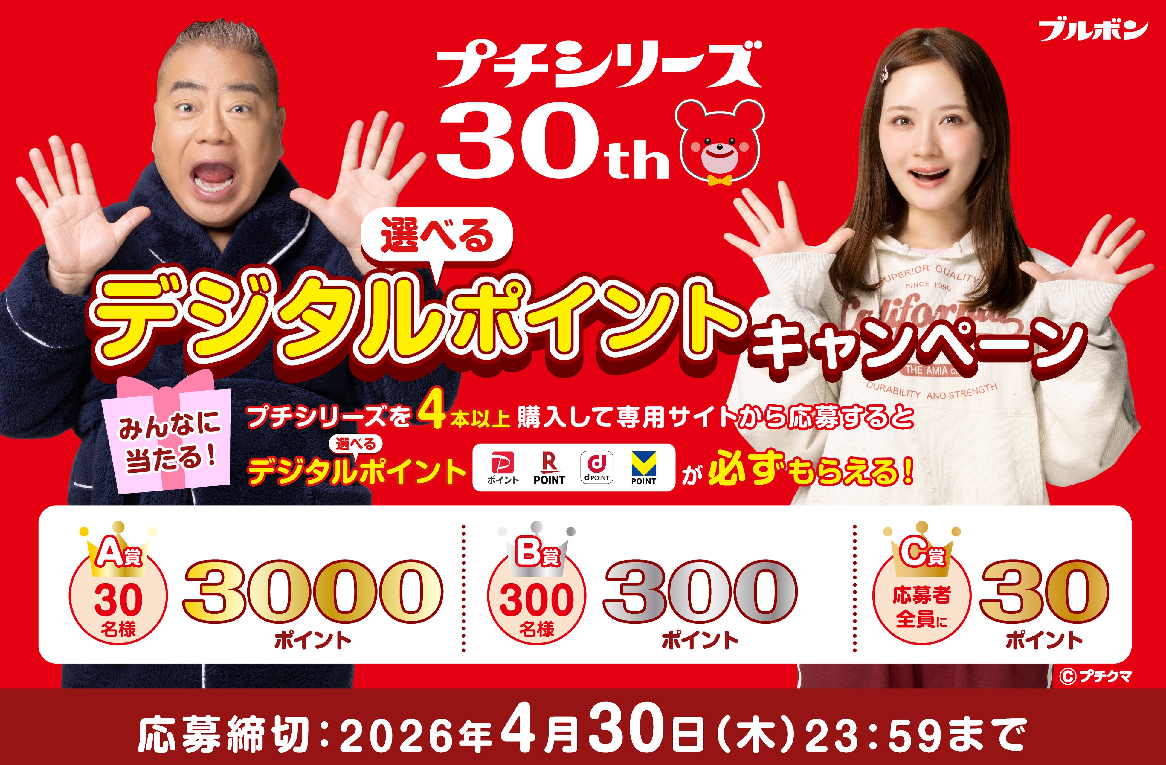 さらに、プチシリーズ発売30周年を記念して、プチシリーズを4本以上購入したレシートでキャンペーンサイトから応募できる「選べるデジタルポイント キャンペーン」を開始します。