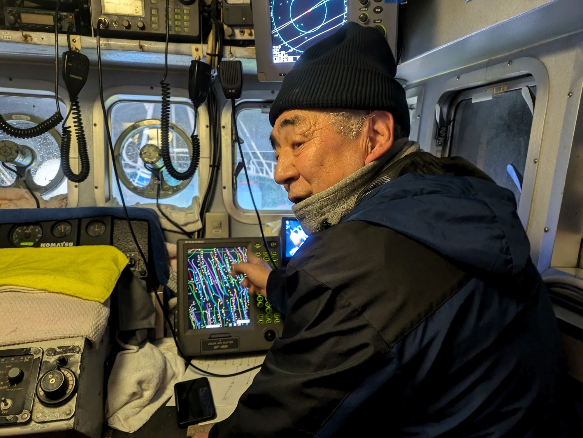 18歳で漁師となり、長年舵を握ってきた渡邊さんですが、レーダーやGPSを使いこなし、広い海の中、仕掛けたカゴにピタリと船を寄せていきます。