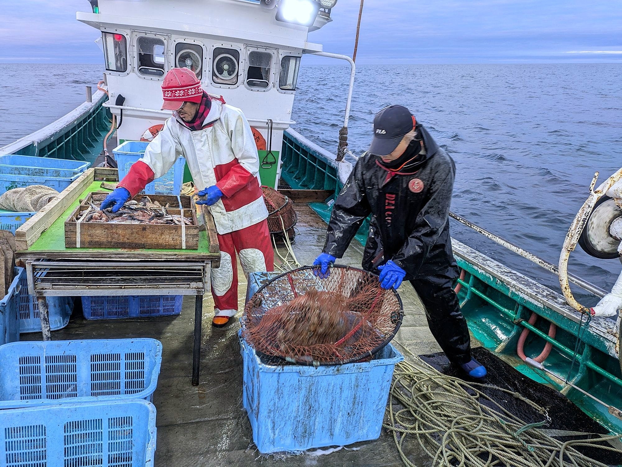 波で揺れる甲板では、乗組員が二人一組でカゴを引き上げ、素早くイソツブを回収。