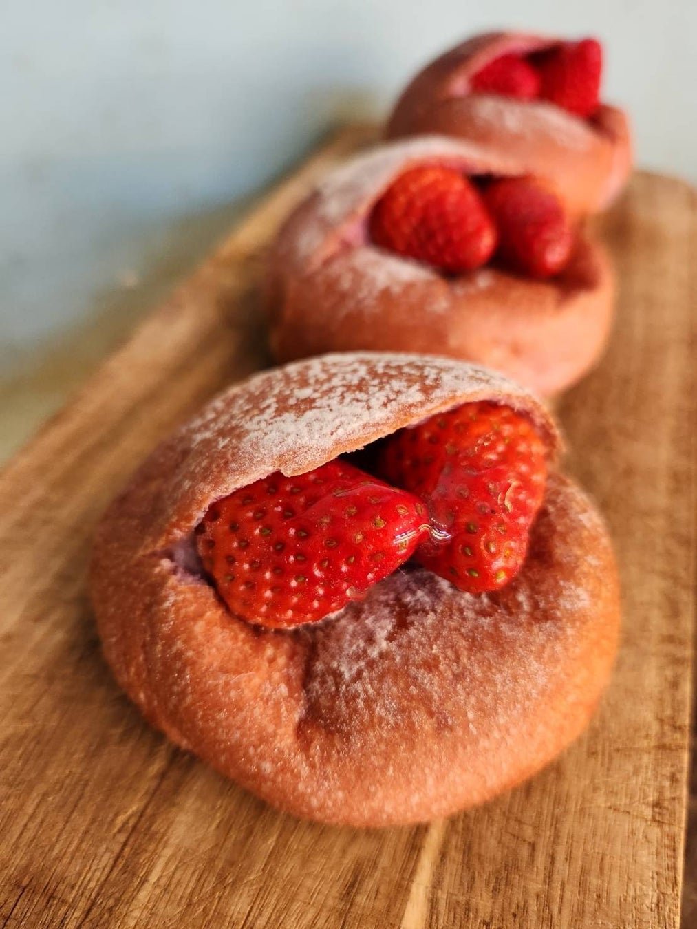 以前の職場でもいちご大福パンを作っていた店主でしたが、いちごを生地に包んで焼くと、せっかくの香りや食感が失われてしまうことに心が引っかかっていました。「静岡はいちごの産地。フレッシュなまま食べてほしい」——そんな想いを妻と話し合い、パン生地に切り込みを入れてフレッシュいちごを挟むというアイデアが生まれました。