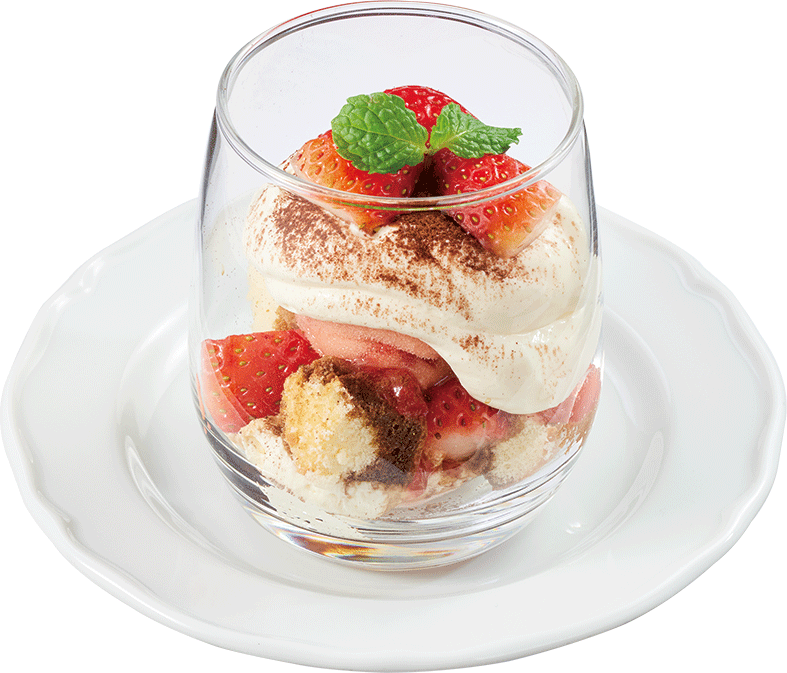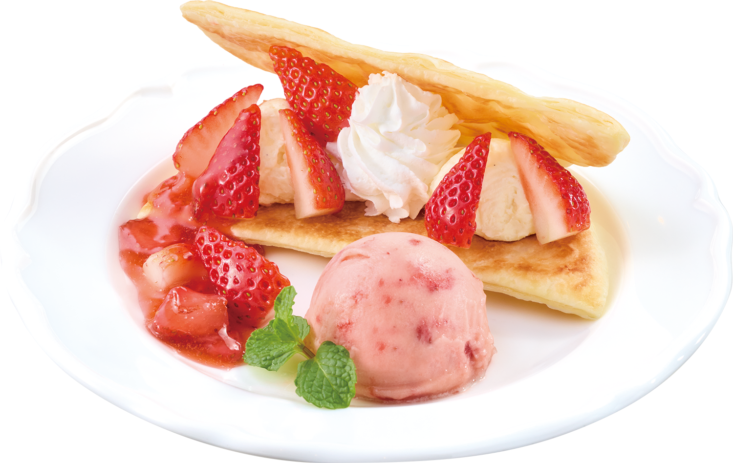注文ごとに店内で焼き上げるサクッとした食感のパイに、ふんわりとしたカスタードホイップとフレッシュな苺を合わせました。イタリアジェラート協会認定のストロベリージェラート、果肉感あふれる苺ソースを添えた苺づくしの一皿です。