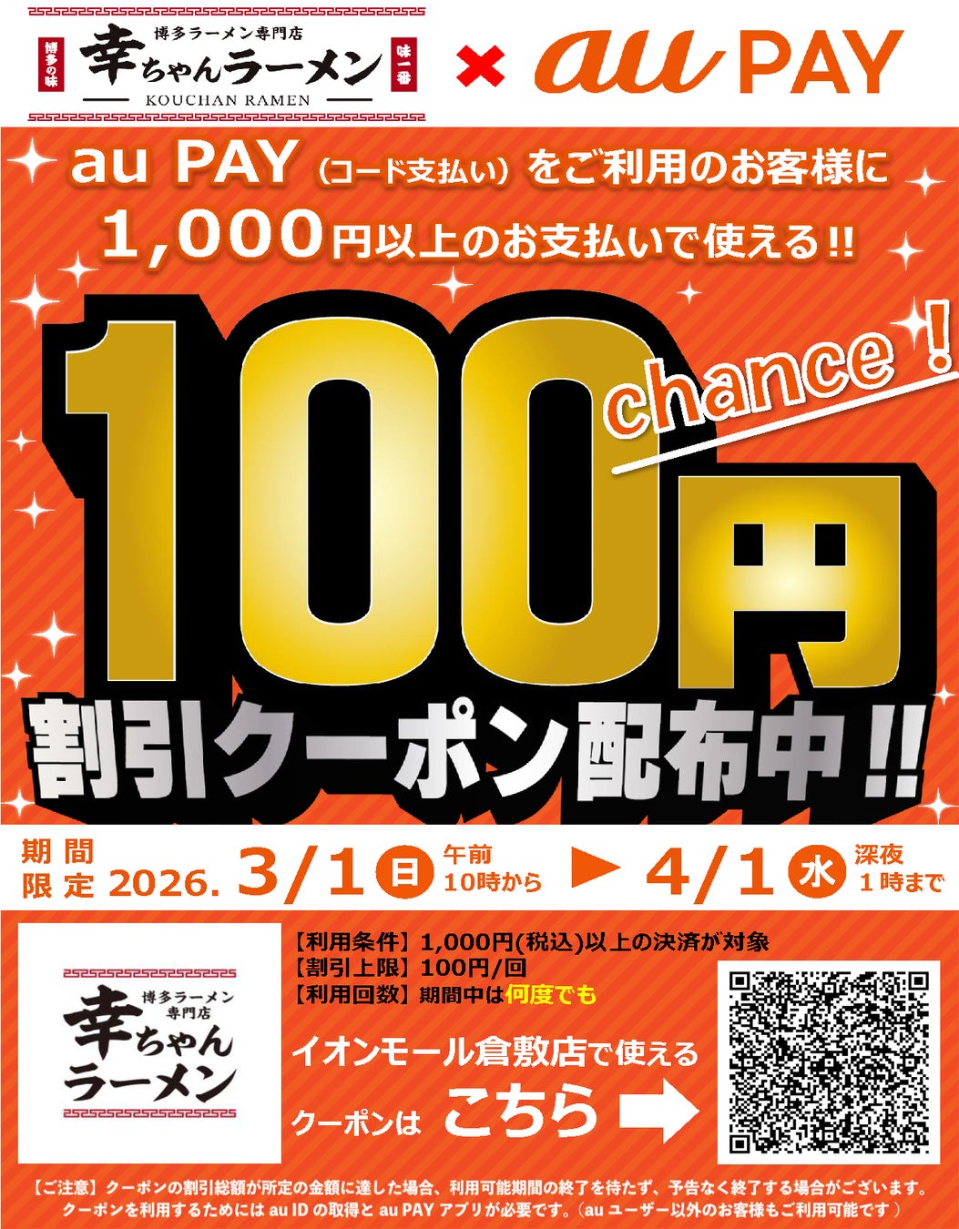世界10カ国90店舗以上を展開、ラーメンのグローバルブランド、博多⼀幸舎や幸ちゃんラーメンを運営する、株式会社ウインズジャパンホールディングス(所在地 福岡県福岡市博多区、代表取締役社⻑ 吉村 幸助 以下当社)は、博多一幸舎 博多駅筑紫口店・ドライブイン一幸舎 空港店・幸ちゃんラーメン イオンモール倉敷店・博多中華そば 幸ノ助 住吉本店の4店舗でKDDI(株)でスマートフォン決済サービス「au PAY」のご利用で使える割引クーポンを、ただいま配布しております。ラーメンなどがお得に食べられる機会となっておりますので、この機会にぜひ、皆様お誘いあわせの上お越しください。