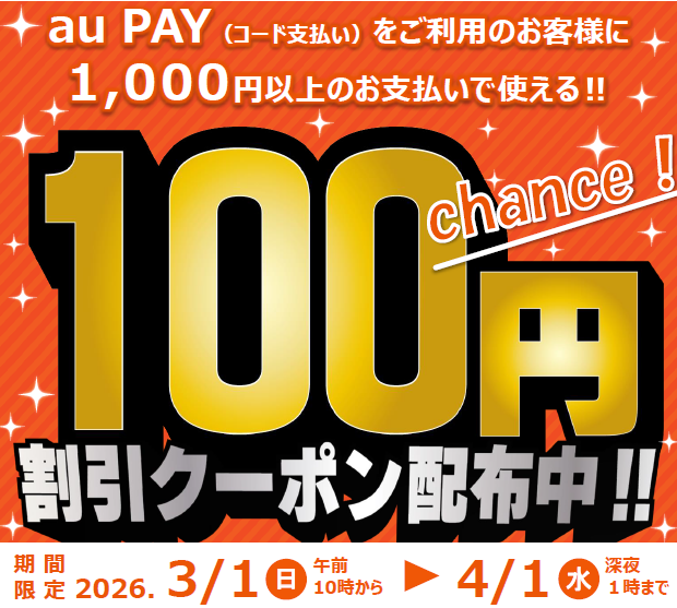 期間中au PAYのコード決済をご利用いただくと、1,000円(税込)以上のお支払いで100円OFFのクーポンがご利用いただけます!