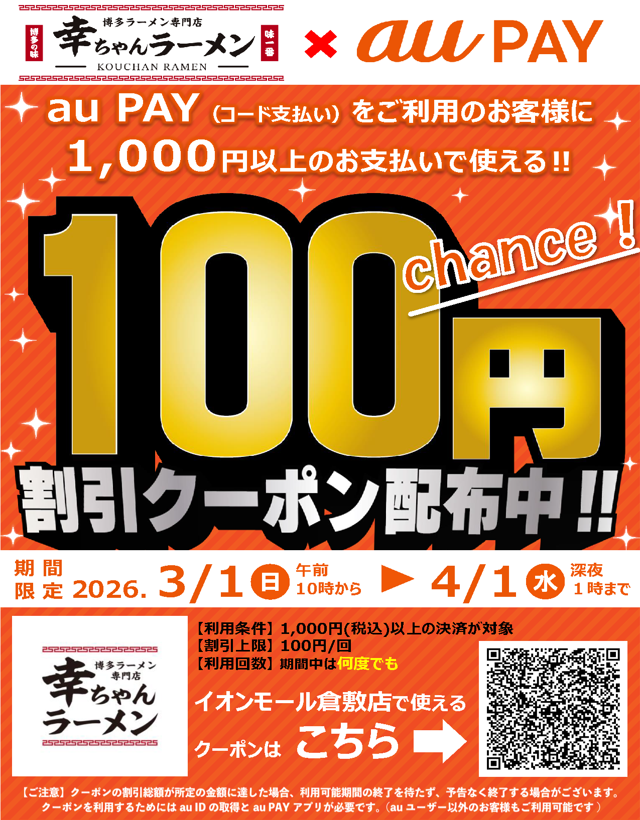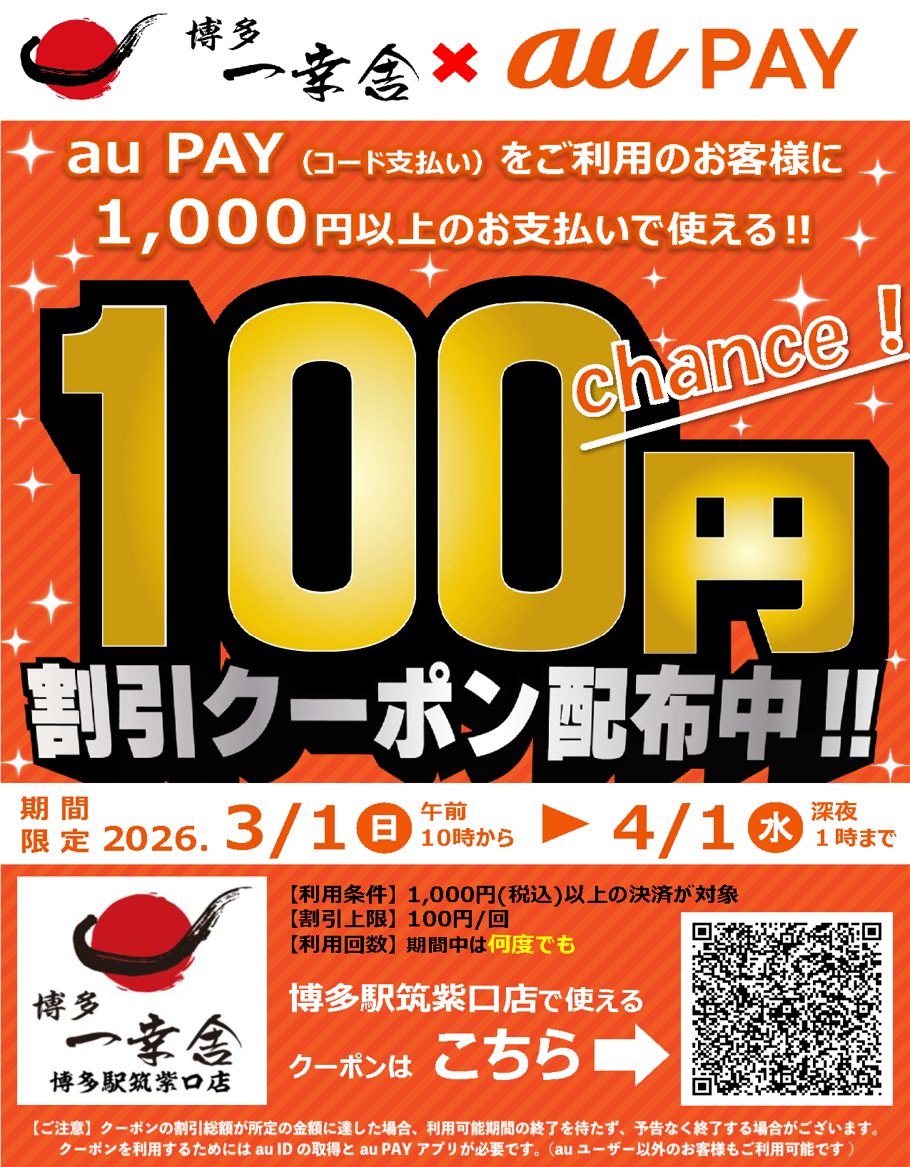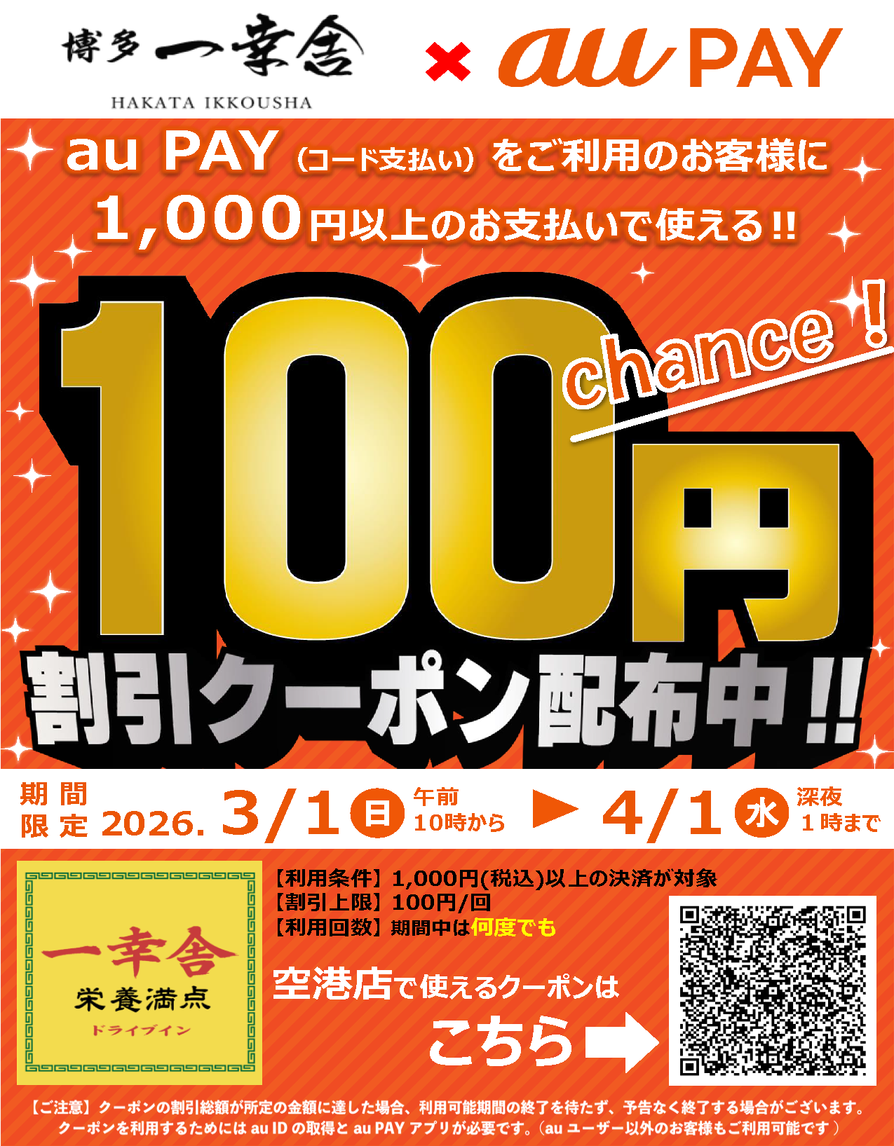 世界10カ国90店舗以上を展開、ラーメンのグローバルブランド、博多⼀幸舎や幸ちゃんラーメンを運営する、株式会社ウインズジャパンホールディングス(所在地 福岡県福岡市博多区、代表取締役社⻑ 吉村 幸助 以下当社)は、博多一幸舎 博多駅筑紫口店・ドライブイン一幸舎 空港店・幸ちゃんラーメン イオンモール倉敷店・博多中華そば 幸ノ助 住吉本店の4店舗でKDDI(株)でスマートフォン決済サービス「au PAY」のご利用で使える割引クーポンを、ただいま配布しております。ラーメンなどがお得に食べられる機会となっておりますので、この機会にぜひ、皆様お誘いあわせの上お越しください。