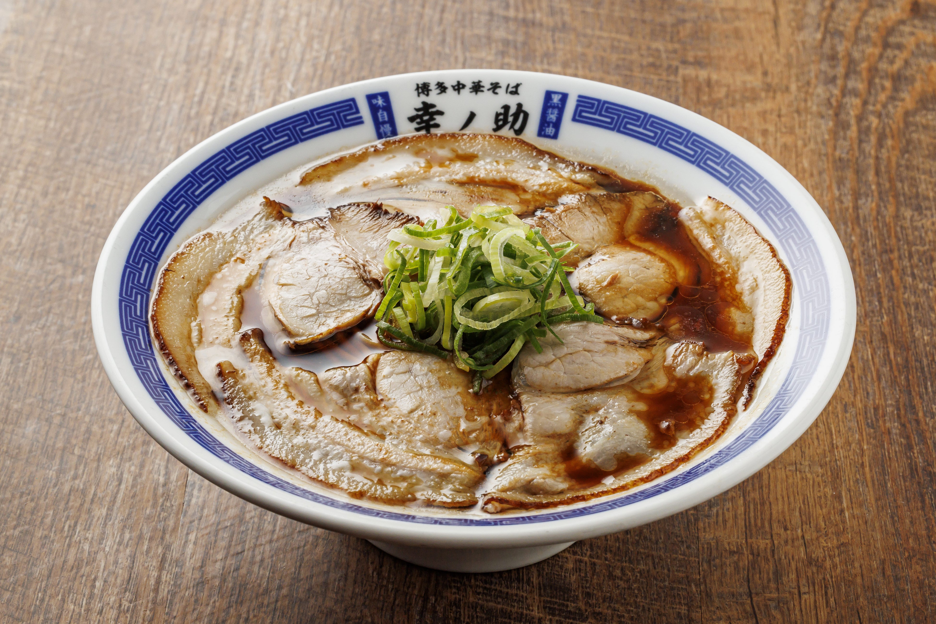 幸ノ助の中華そばの特徴は、インパクトのある漆黒のスープが自慢で、その味は、福岡で創業120余年の醤油蔵元である「ヤマタカ醤油」で作られる「熟成醗酵醤油」を使用。そして、店内でも独自の熟成方法でじっくりと時間をかけて旨味を増し完成させたこだわりの醤油タレを使用しています。鶏ガラと豚でとったあっさりながらも、旨味の濃いスープと合わせると、深みのある芳醇な味わいを感じられますが、後味はスッキリと食べられる絶品のスープです。麺は福岡の製麺所『製麺屋慶史』が作る特注の中太ストレート麺。小麦の旨味と、しなやかでもちもちとした食感は濃い醤油スープにピッタリです。トッピングには福岡県産の青ネギとたっぷりのチャーシュー。チャーシューは味付けにこだわりの醤油タレを使用しており、麺やスープとマッチし食べ応えがあります。そんな博多中華そば幸ノ助は、お⼦様からご年配の⽅、⽼若男⼥問わず幅広い⽅達より⽀持いただいております。