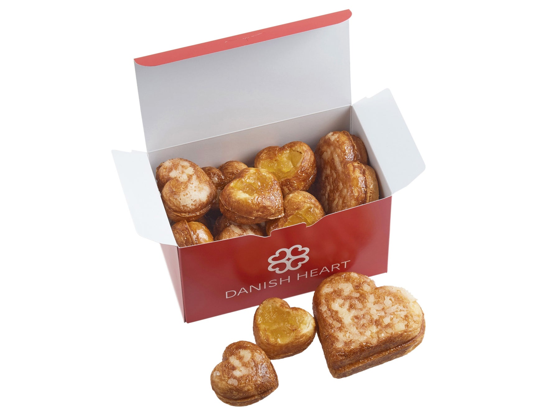 デニッシュハート2個、ミニデニッシュハート12個を専用のボックスに詰め合わせました。手土産におすすめです。