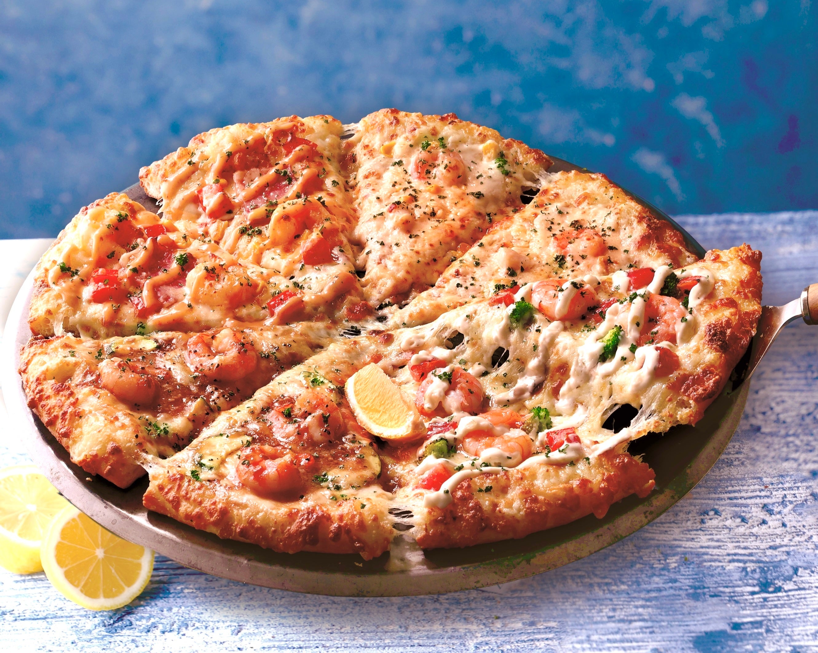 それぞれ異なるシーフードの魅力を、ひとつのピザで楽しめる贅沢な構成です。
