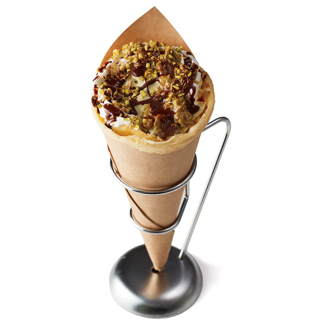 もっちり香ばしいクレープに、生クリーム、ローストピスタチオ、カダイフ、ジェラートなどを贅沢に包み込みました。