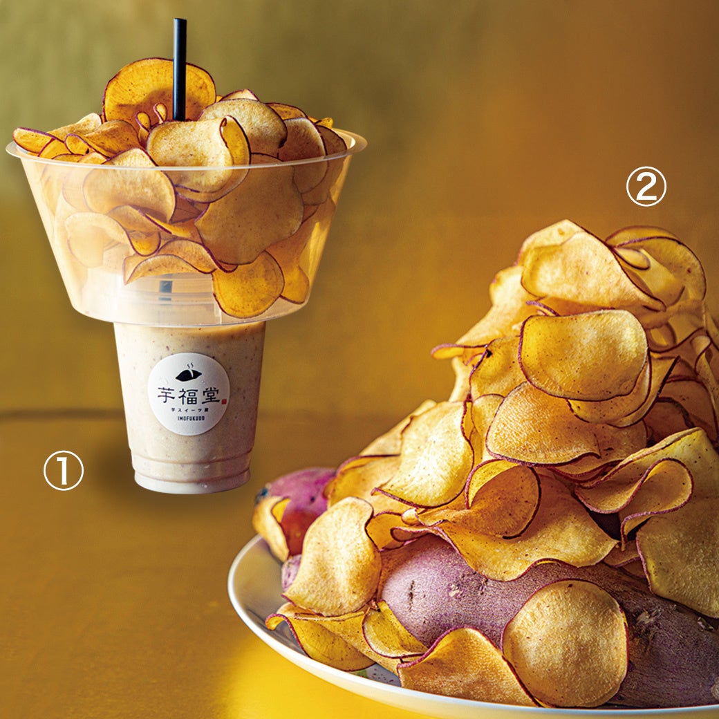 紅はるかと国産牛乳だけで作った焼き芋ドリンクと紅あずまを使用したパリッと香ばしいチップスを楽しめます。