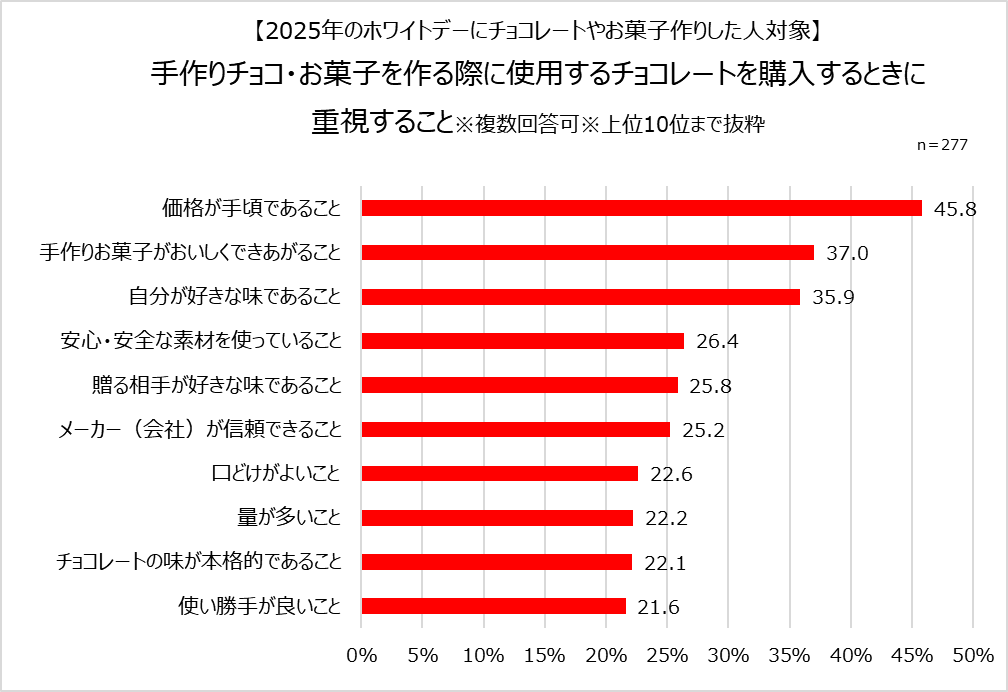 手作りチョコレート・お菓子を作る際に使用するチョコレートを購入するときに重視することとしては、1位に「価格が手頃であること」がランクインし、半数近く(45.8%)の人が回答しました。リーズナブルに材料を揃え、工夫次第でコストパフォーマンスの良さを実感できるという点で、お菓子作りは多くの人に受け入れられていることが予想されます。