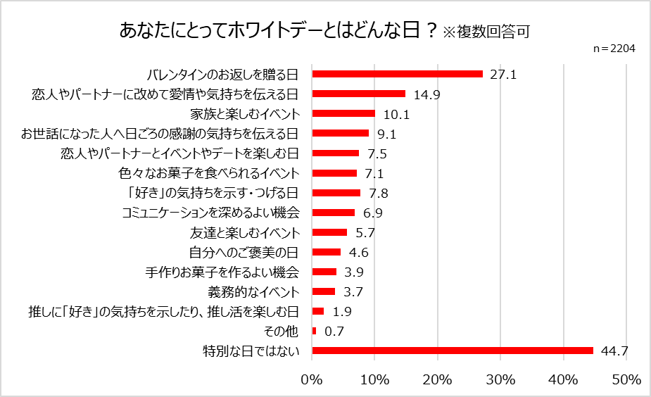 また、ホワイトデーはどんな日か聞いたところ、「バレンタインのお返しを贈る日(27.1%)」と回答した人が最も多く約30%でした。次いで、「恋人やパートナーに改めて愛情や気持ちを伝える日(14.9%)」「家族と楽しむイベント(10.1%)」という結果が続き、誰かにプレゼントや気持ちをおくる日と認識している人が多いことが分かりました。