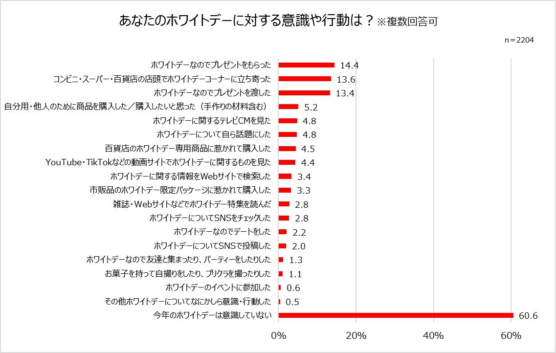 ホワイトデーに対する意識や行動について聞いたところ、ホワイトデーを何かしら意識していた人は約40%だったことが分かりました。意識していた人の内、「ホワイトデーなのでプレゼントをもらった(14.4%)」「コンビニ・スーパー・百貨店の店頭でホワイトデーコーナーに立ち寄った(13.6%)」「ホワイトデーなのでプレゼントを渡した(13.4%)」などと回答した人が多くいました。