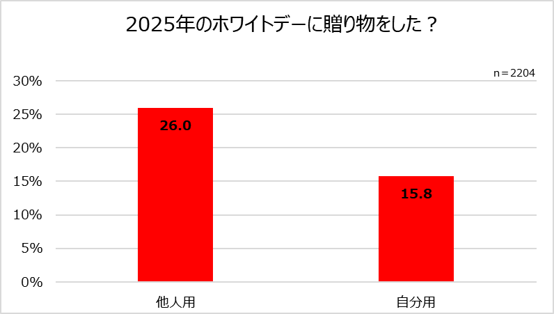 ホワイトデーは「お返しを贈る日」という認識が広く認知されており、他者に贈り物をした人が26.0%いる一方で、自分に贈り物をした人も15.8%いて、自己消費という楽しみ方が一定程度見らました。