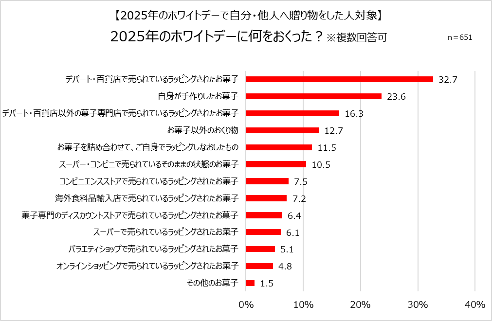 ホワイトデーに贈り物をした人に何をプレゼントしたか聞いたところ、1位は「デパート・百貨店で売られているラッピングされたお菓子(32.7%)」、2位は「自身が手作りしたお菓子(23.6%)」で、手作りお菓子をホワイトデーにプレゼントした人は5人に1人以上(20%以上)いることが分かりました。
