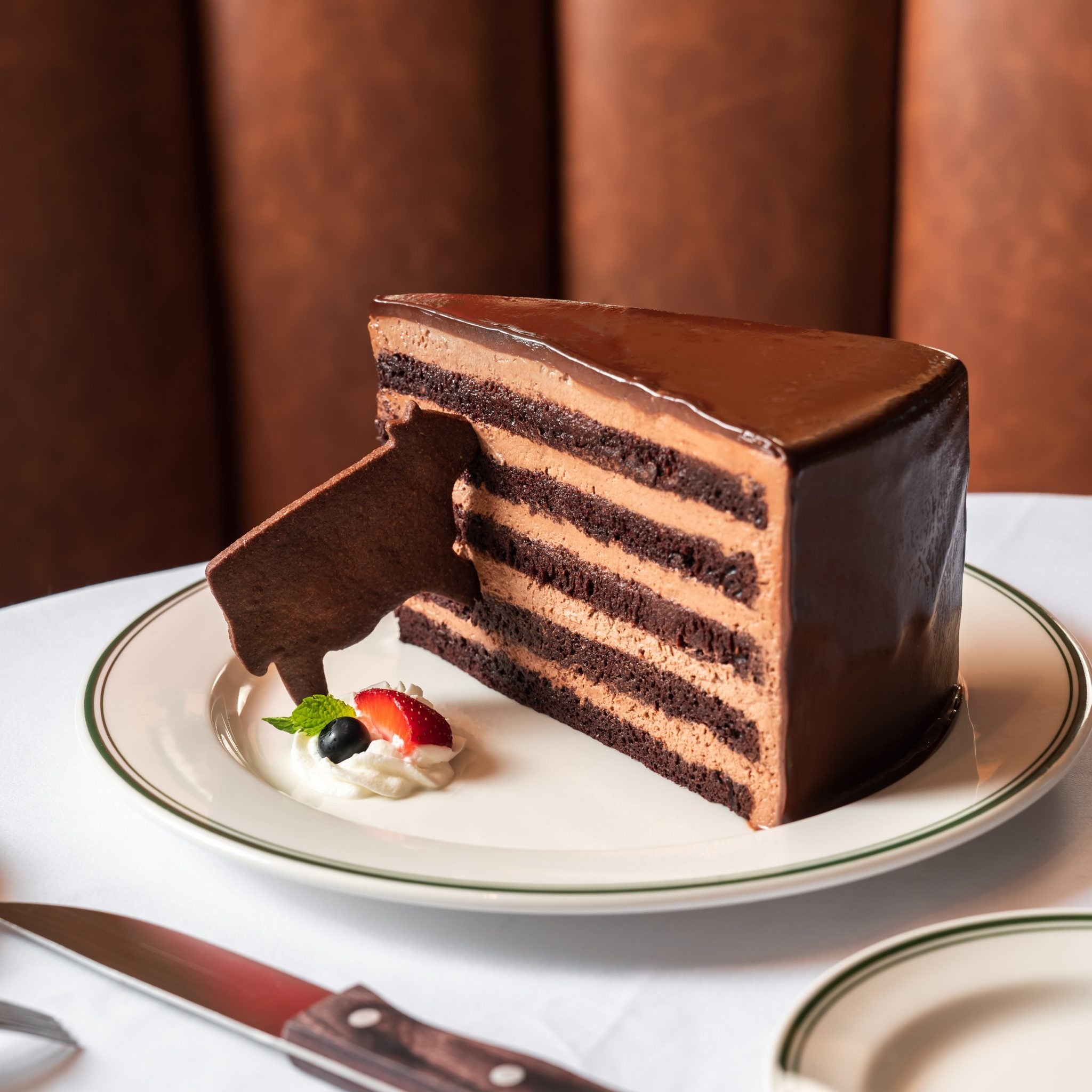 デザートの目玉は、Smith & Wollenskyで“名物中の名物”として愛される「ギガンティックチョコレートケーキ」。直径36cm、高さ15cmという圧倒的なスケールで何層にも重なる濃厚なケーキは、リッチでクラシックなアメリカンスタイルを象徴する一皿です。甘美で重厚な味わいと迫力に満ちた佇まいは、まさに美食の夜を完結させる「華麗なる終幕」。テーブルに運ばれた瞬間に場を華やがせる、Smith & Wollenskyならではの至高のデザートです。