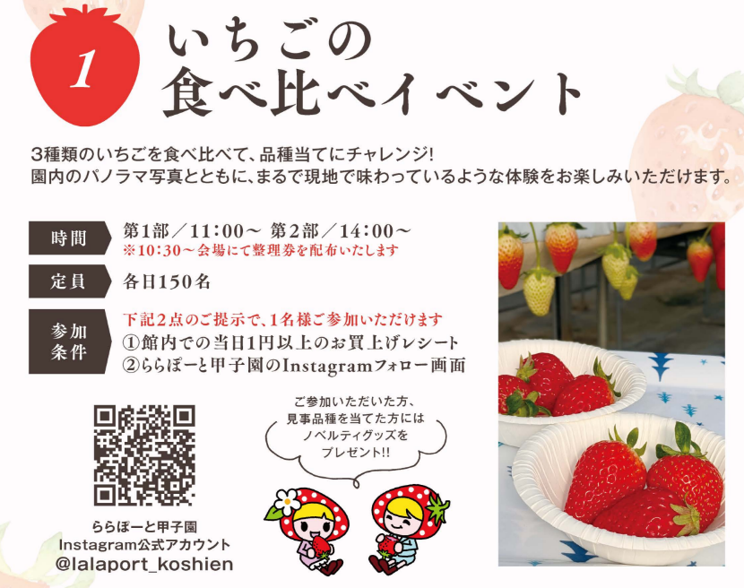 A. 一番の目玉は、たかぎ村産のいちご3品種(章姫、紅ほっぺ、ゆめのか)の「食べ比べイベント」です 。見事品種当てに正解した方には、ノベルティグッズをプレゼントいたします 。また、たかぎ村の「いちご狩りペア招待券」や「上高地あずさ珈琲のチケット」など、豪華景品が当たる白熱の「じゃんけん大会」も必見の注目企画です 。