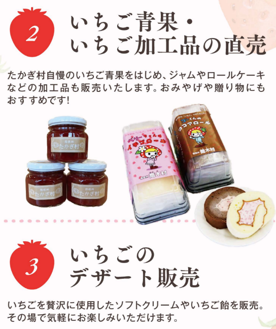 A. たかぎ村から産地直送された新鮮な「いちご青果」や、ジャム・ロールケーキなどの加工品を直売コーナーでご用意しております 。さらに、その場で楽しめるデザートとして、いちごを贅沢に使用したソフトクリームや、いちご飴も販売いたします 。