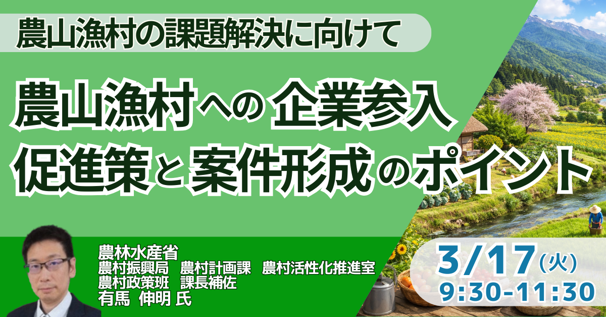 JPI(日本計画研究所)は、農林水産省 農村振興局 農村計画課 農村活性化推進室 農村政策班 課長補佐 有馬 伸明 氏を招聘し、農山漁村への企業参入促進策と案件形成のポイントについて詳説いただくセミナーを開催します。