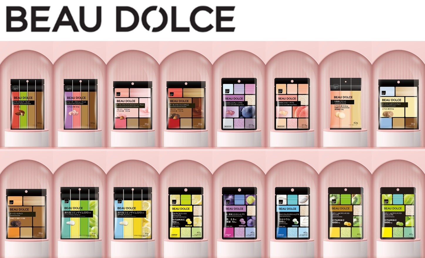 「BEAU DOLCE(ボウドルチェ)」とは「Beau(美)」と「Dolce(菓子)」を掛け合わせた造語で、美味しさを追求し、ヒアルロン酸、GABA、乳酸菌、コラーゲンなどの美容サポート成分を配合した「美容おやつ」です。「一口に、喜びと美しさを。BEAU DOLCEで、毎日をもっと魅力的に。」をテーマに、コスメを手に取るときのようなワクワク感とともに、ご褒美時間を提案する新しい商品シリーズです。今回の新商品を加え、全22SKUを展開します。